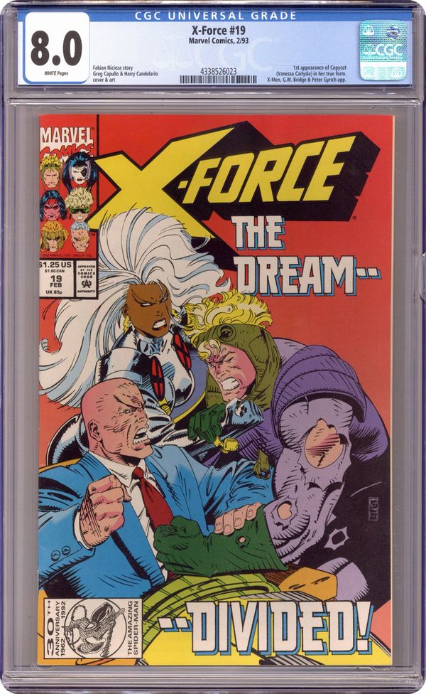 Ended Dec 24 2023 Winning Bid $11 Direct Edition. Cover pencils by Greg Capullo, inks by Harry Candelario. The Open Hand, The Closed Fist, script by Fabian Nicieza, pencils by Greg Capullo, inks by Harry Candelario; X-Force splits with Xavier and ventures forth on their own; Siryn joins. 36 pgs. $1.25. Cover price $1.25. Grade: CGC 8.0 explanation of grade Condition: Used (collectible)