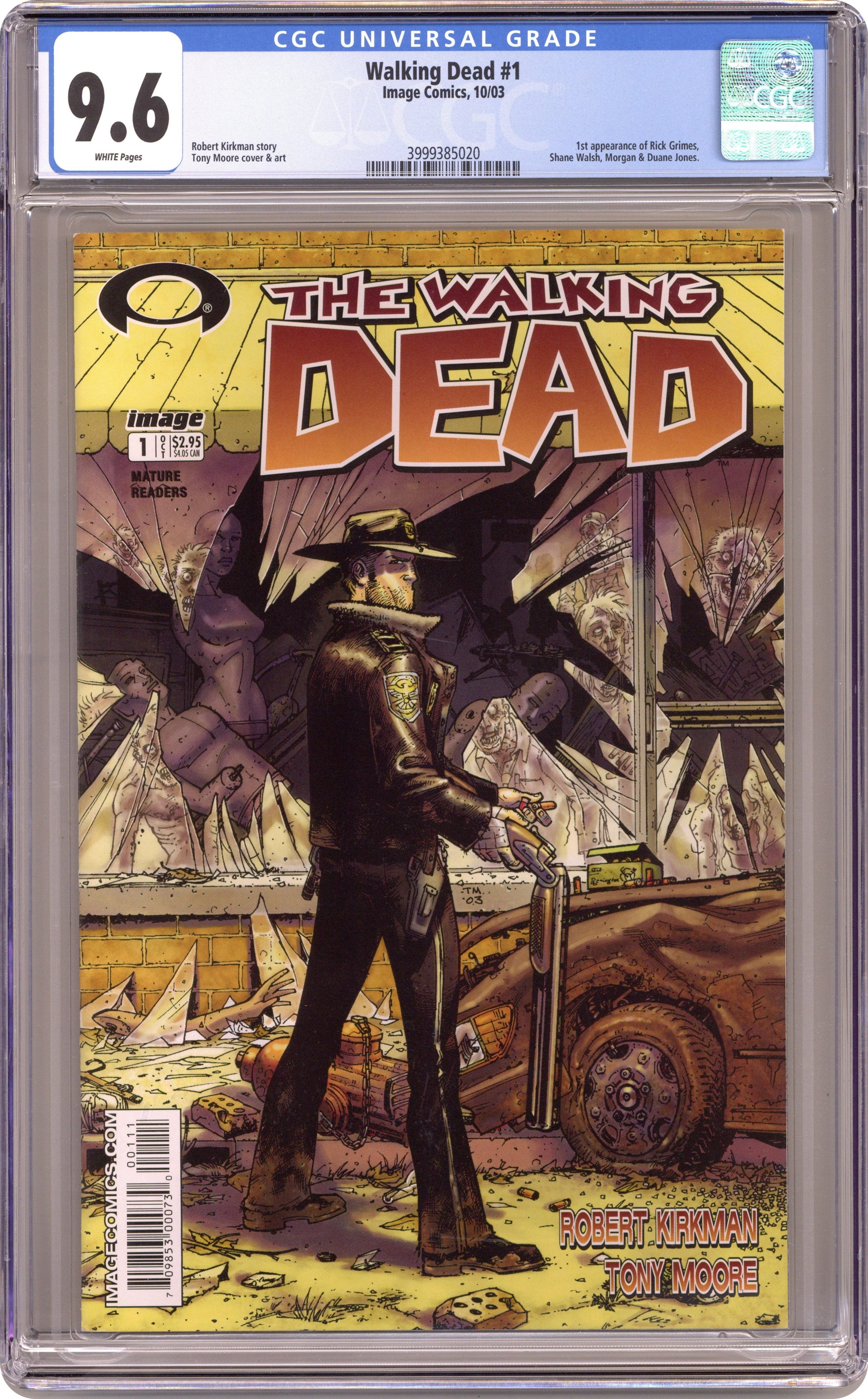 1ST PRINTING. (W) Robert Kirkman (A) Tony Moore BW 32pp $2.95 Monthly ongoing Series In stores the week of October 1st. THE CONCEPT: How many hours are in a day when you don't spend half of them watching television? When is that last time any of us REALLY worked to get something that we wanted? How long has it been since any of us really NEEDED something that we WANTED? The world we knew is gone. The world of commerce and frivolous necessity has been replaced by a world of survival and responsibility. An epidemic of apocalyptic proportions has swept the globe, causing the dead to rise and feed on the living. In a matter of months society has crumbled, no government, no grocery stores, no mail delivery, no cable TV. In a world ruled by the dead, we are forced to finally start to live. THIS ISSUE: Rick Grimes is not prepared for this. A couple months ago he was a small town cop who had never shot anyone and only ever saw one dead body. Separated from his family he must now sort through the death and confusion to try and find his wife and son. All the while fighting for his survival. How did this happen? How did things get so bad so fast? How will things ever return to normal after everything he's seen? From the guys behind BATTLE POPE and BRIT comes something COMPLETELY different. Cover price $2.95. Grade: CGC 9.6 explanation of grade Condition: Used (collectible)