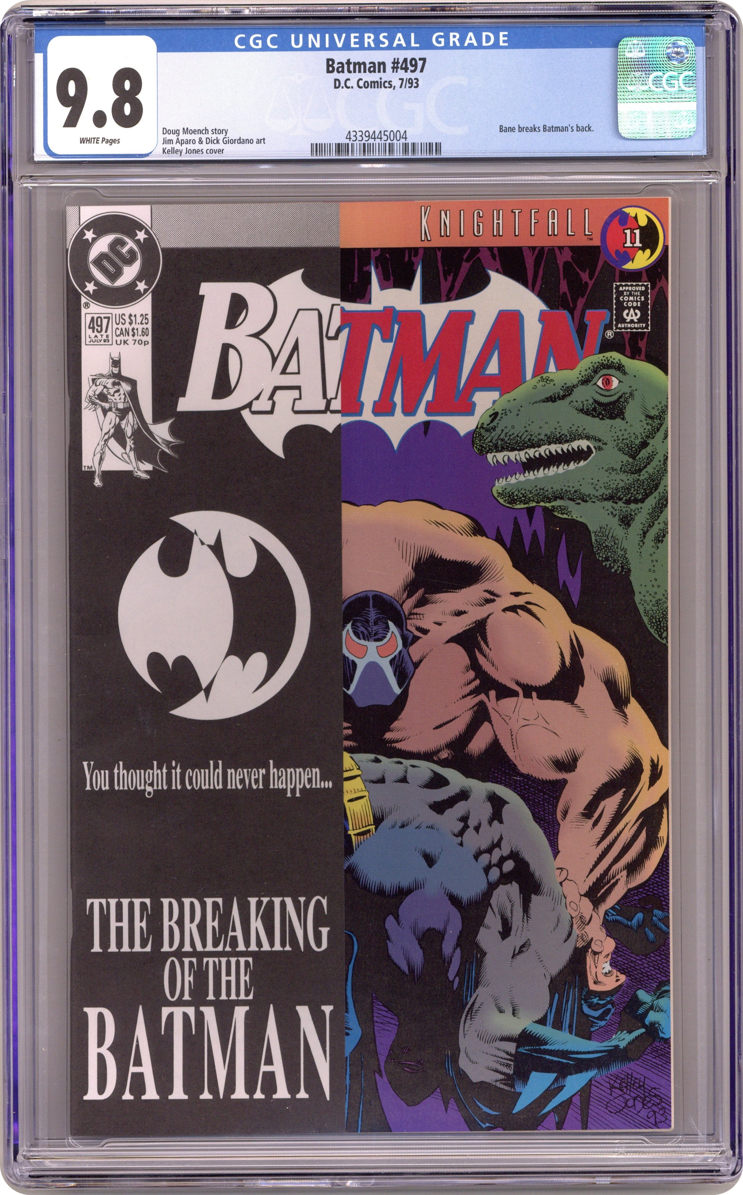 Ended Dec 19 2023 Winning Bid $58 Direct Edition with Overlay cover. Bane breaks Batman's back in Batman KnightFall Part 11. Home turf does not prove an advantage when Bane breaks Batman's back in the Batcave in "The Broken Bat." KnightFall continues in Detective Comics (1937- ) #664. Written by Doug Moench. Pencils by Jim Aparo. Inks by Dick Giordano. Cover by Kelley Jones. 36 Pages, Full Color. Cover price $1.25. Grade: CGC 9.8 explanation of grade Condition: Used (collectible)