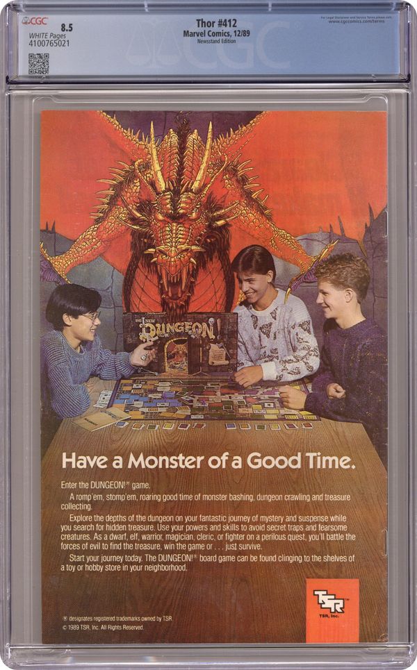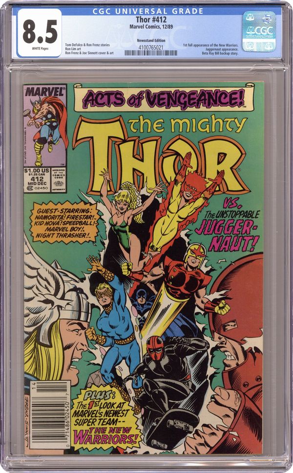 Ended Dec 12 2023 Winning Bid $26 Direct Edition. Cover pencils by Ron Frenz, inks by Joe Sinnott. Acts of Vengeance crossover. First full appearance of the New Warriors in "Introducing the New Warriors," script by Ron Frenz (Co-plot) and Tom DeFalco, pencils by Ron Frenz (layouts), inks by Joe Sinnott (finished art); With Thor down for the count, the New Warriors arrive and battle the Juggernaut; Thor recovers his strength and joins the fray as he and the kids are finally able to banish Juggy to another dimension. Beta Ray Bill back-up, "Freedom Is Only A Choice Away," script by Tom DeFalco, pencils by Ron Lim, inks by Mike DeCarlo; Bill has been trapped and is being used to help power a spaceship that feeds off of psychic energy; When the people of his race are threatened, however, he breaks free and faces Captain Orack. 36 pgs., full color. $1.00. Cover price $1.00. Grade: CGC 8.5 explanation of grade Condition: Used (collectible)