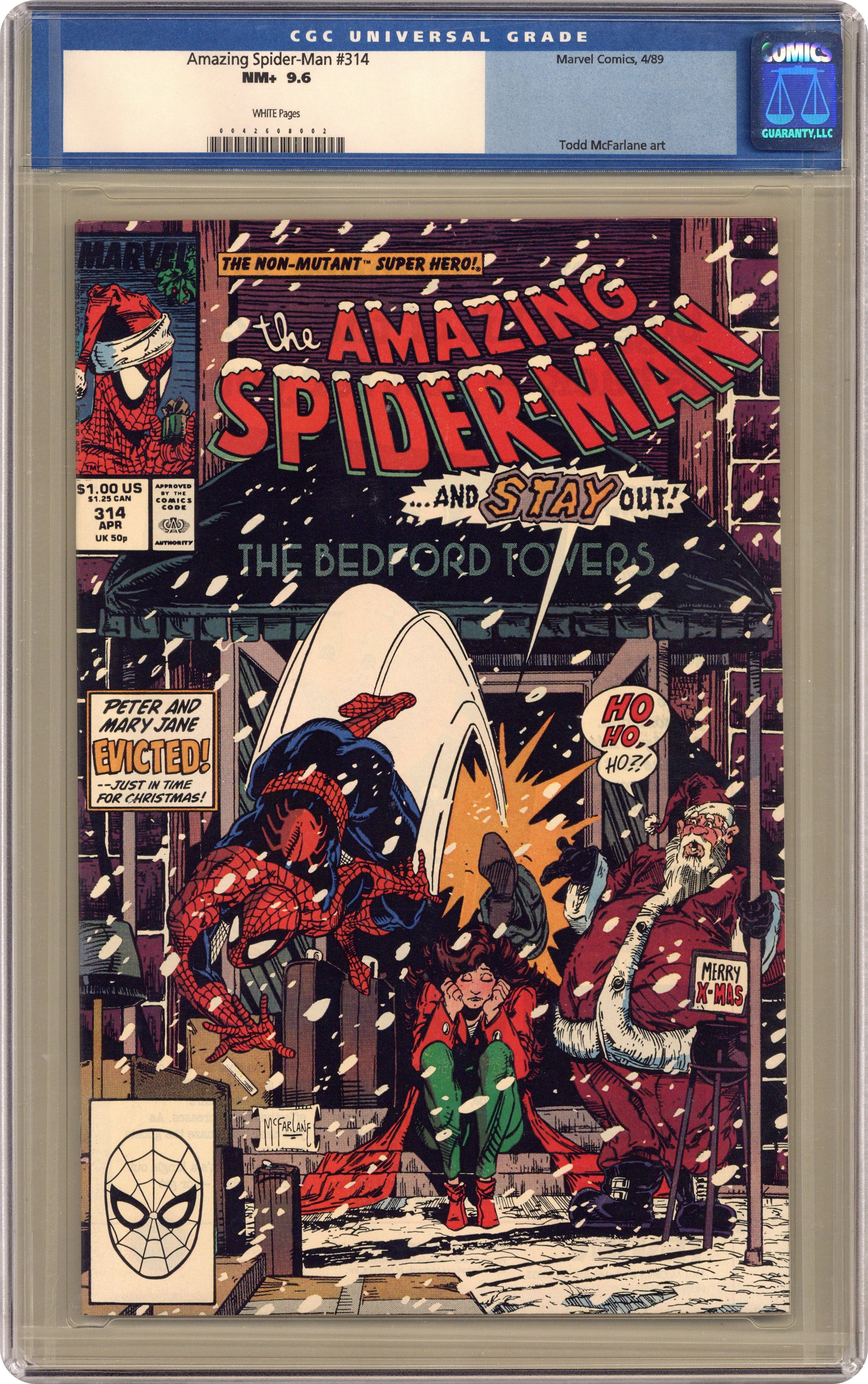 Ended Dec 22 2023 Winning Bid $42 Direct Edition. "Down and Out in Forest Hills" Script by David Michelinie. Art by Todd McFarlane. Cover by Todd McFarlane. In a cold-blooded move from his prison cell, Jonathon Caesar evicts Peter and Mary Jane from their Bedford Towers condo just in time for Christmas! And now the Parkers have to find a new place to live ASAP! One option is to move back in with Aunt May in Forest Hills! However the famous American novelist Thomas Wolfe once said: "You can't go back home again." Where will the Amazing Spider-Man and his wife decide to live? A heartwarming story. Cameo appearances by J. Jonah Jameson, Joe Robertson, Kristy Watson, and Flash Thompson. (Note: The letters page includes a letter from Topps comics publisher Charles Novinskie.) 36 pages. Cover price $1.00. Grade: CGC 9.6 explanation of grade Condition: Used (collectible)