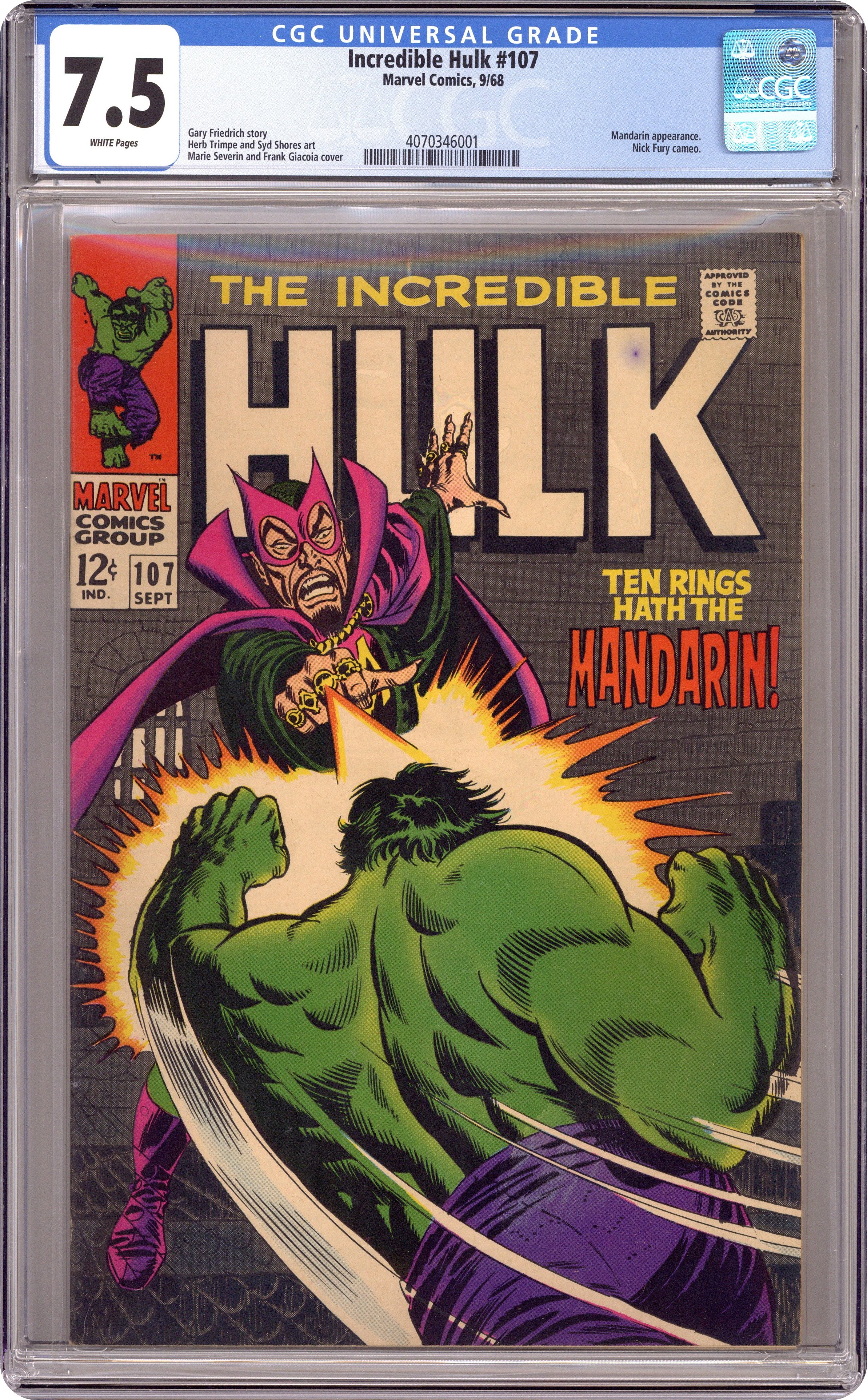 Ended Dec 26 2023 Winning Bid $50 Cover pencils by Marie Severin and John Romita (Mandarin figure), inks by Frank Giacoia and John Romita (Mandarin figure). Ten Rings Hath...the Mandarin!, script by Gary Friedrich, art by Herb Trimpe; Just as Yuri and his men are about to decimate the Hulk, Nick Fury shows up to take his Russian foe down; The Mandarin zaps the Hulk to his compound and puts him through his paces to see if the jade giant would make a worthy ally in his bid to take over the world. 36 pgs. $0.12. Cover price $0.12. Grade: CGC 7.5 explanation of grade Condition: Used (collectible)