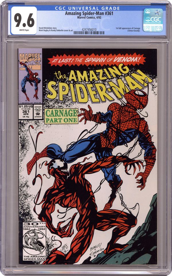 Ended Dec 22 2023 Winning Bid $138 First Printing. Direct Edition. First (full) appearance of Carnage in "Savage Genesis!" Part 1 of 3. Script by David Michelinie. Pencils by Mark Bagley. Inks by Randy Emberlin. Cover by Mark Bagley and Randy Emberlin. Blood runs in the streets as a serial killer roams New York City! And as the web-slinger investigates the murders, he notices a very disturbing similarity to another killer's modus operandi! In a burned-out building in Brooklyn, the spectacular one comes face-to-face with his new homicidal foe...Carnage! Can the wall-crawler end Cletus Kasady's rampage in their very first encounter? Cameo appearances by Aunt May and Mary Jane Watson. Flashback cameo by Venom. (Note: This three-part story was reprinted in 2011 in the trade paperback: Spider-Man -- The Vengeance of Venom.) 36 pages, full color. $1.25 cover price. NOTE: Most of these were distributed with slight printer tears in the bottom edge of the cover. Cover price $1.25. Grade: CGC 9.6 explanation of grade Condition: Used (collectible)