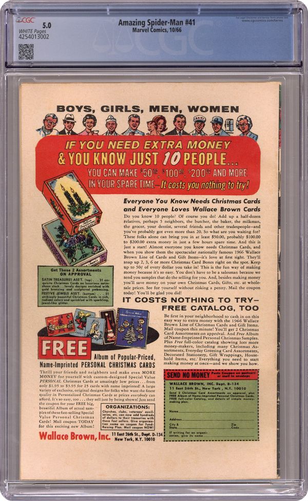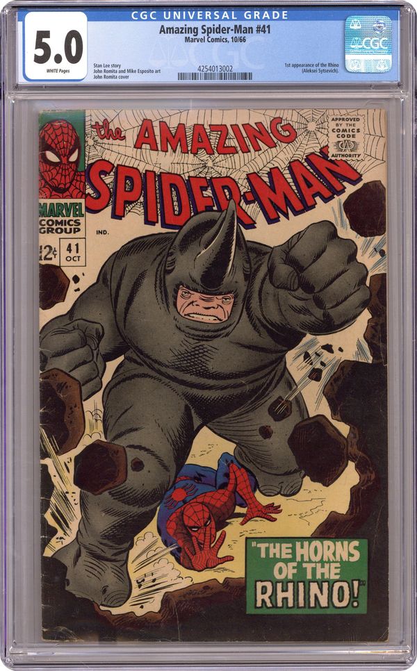 Cover pencils by John Romita Sr., inks by Mike Esposito and John Romita (touch-ups). First appearance of the Rhino in The Horns of the Rhino!, script by Stan Lee, pencils by John Romita Sr., inks by Mike Esposito (as M. Demeo) and John Romita Sr. (touch-ups); The Rhino attempts to kidnap John Jameson to turn him over to foreign powers that want his secrets about the U.S. space program; Spider-Man manages to stop the Rhino. Reprinted in Marvel Tales # 30 and 190. 36 pgs., full color. $0.12. Cover price $0.12. Grade: CGC 5.0 explanation of grade Condition: Used (collectible)