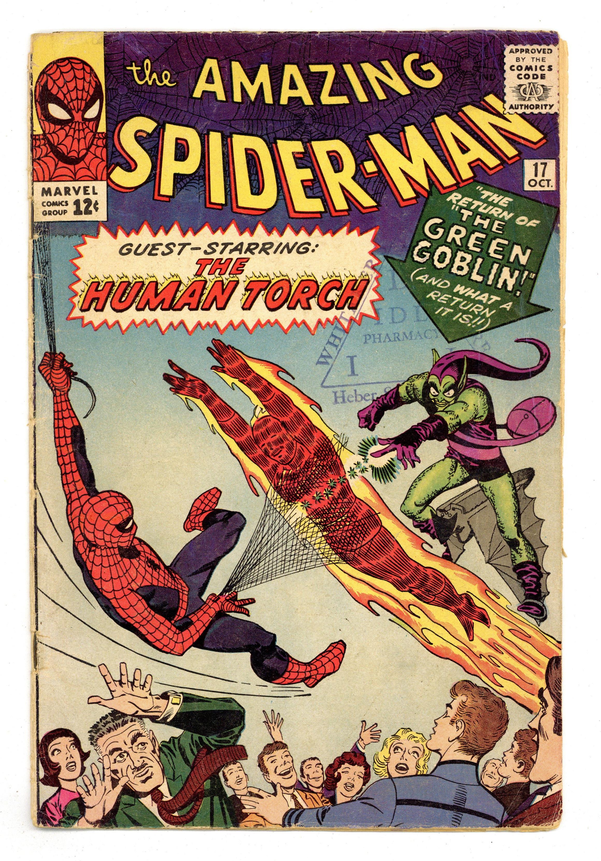 Cover art by Steve Ditko. Second appearance of the Green Goblin in The Return of the Green Goblin!, script by Stan Lee, art by Steve Ditko; Spider-Man attends a fan club meeting organized by Flash Thompson, but the Green Goblin crashes the meeting; Fortunately the Human Torch is in attendance to help Spider-Man; During the battle Spider-Man finds out that Aunt May is in the hospital and he leaves, causing everyone to believe that he is a coward. Reprinted in Marvel Tales # 12 and 155. Letter to the editor by comics writer Doug Moench. 36 pgs. $0.12. Cover price $0.12. Grade: PR 0.5 explanation of grade Condition: Used (collectible)