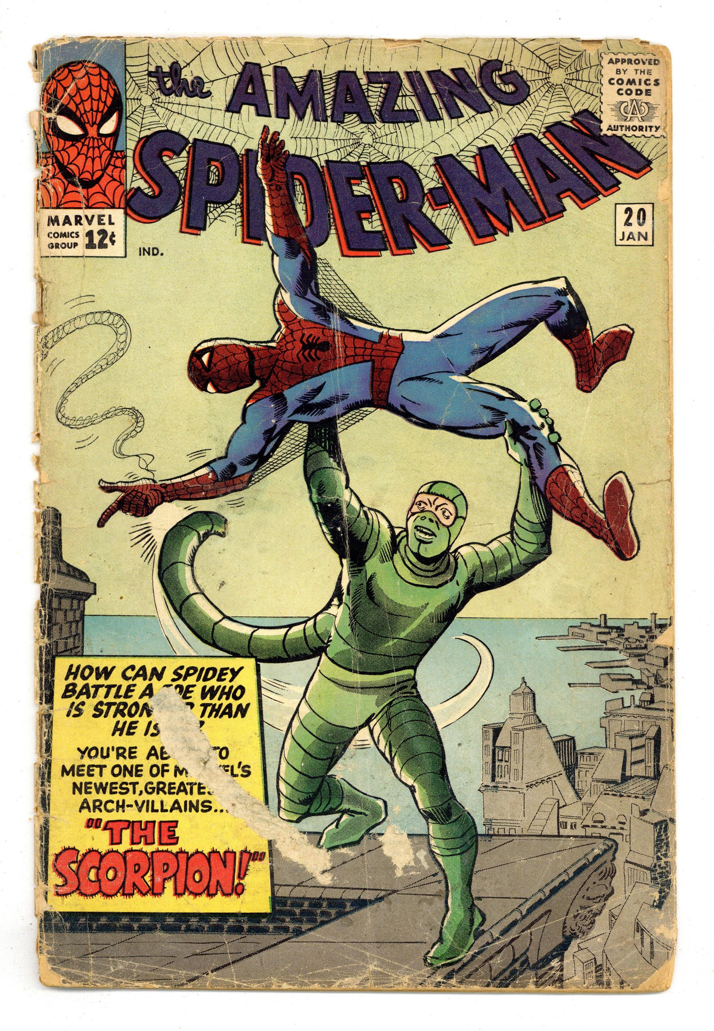 Cover art by Steve Ditko. First appearance of the Scorpion in The Coming of the Scorpion!, script by Stan Lee, art by Steve Ditko; J. Jonah Jameson pays Dr. Stillwell to turn Mac Gargan into the Scorpion to try to capture Spider-Man. Stillwell's formula makes Gargan become more evil than he originally was and the Scorpion goes on a rampage and is finally stopped by Spider-Man. Reprinted in Marvel Tales # 15 and 158. 36 pgs. $0.12. Cover price $0.12. Grade: PR 0.5 explanation of grade Condition: Used (collectible)