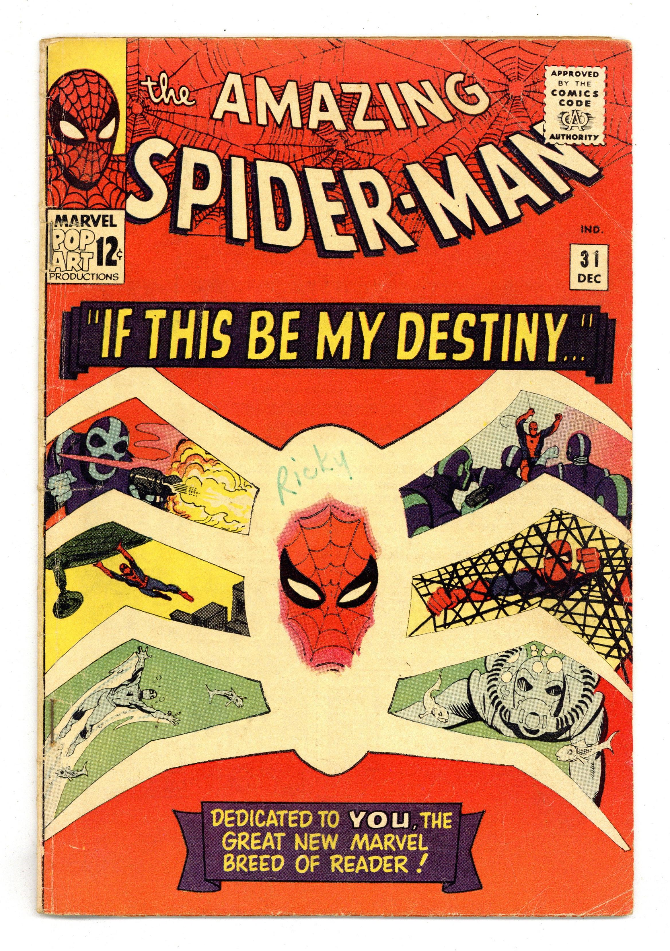 Cover by Steve Ditko. First appearances of Gwen Stacy, Harry Osborn, and Professor Warren. First appearance of the Master Planner (revealed in issue 32 to be Doctor Octopus) in "If This Be My Destiny, script by Steve Ditko (plot) and Stan Lee (script), art by Steve Ditko; Aunt May falls deathly ill on Peter's first day of college. Meanwhile, the Master Planner is stealing scientific gadgets. Marvel Bullpen Bulletins, art by Steve Ditko and Marie Severin; Bullpen Bulletins page discussing staff; Marvel Checklist; ads for Spider-Man T-Shirt and MMMS. Letter to the editor from comics writer Don McGregor. Reprinted in Marvel Tales # 24 and 170. 36 pgs., full color. $0.12. Cover price $0.12. Grade: GD/VG 3.0 explanation of grade Condition: Used (collectible)