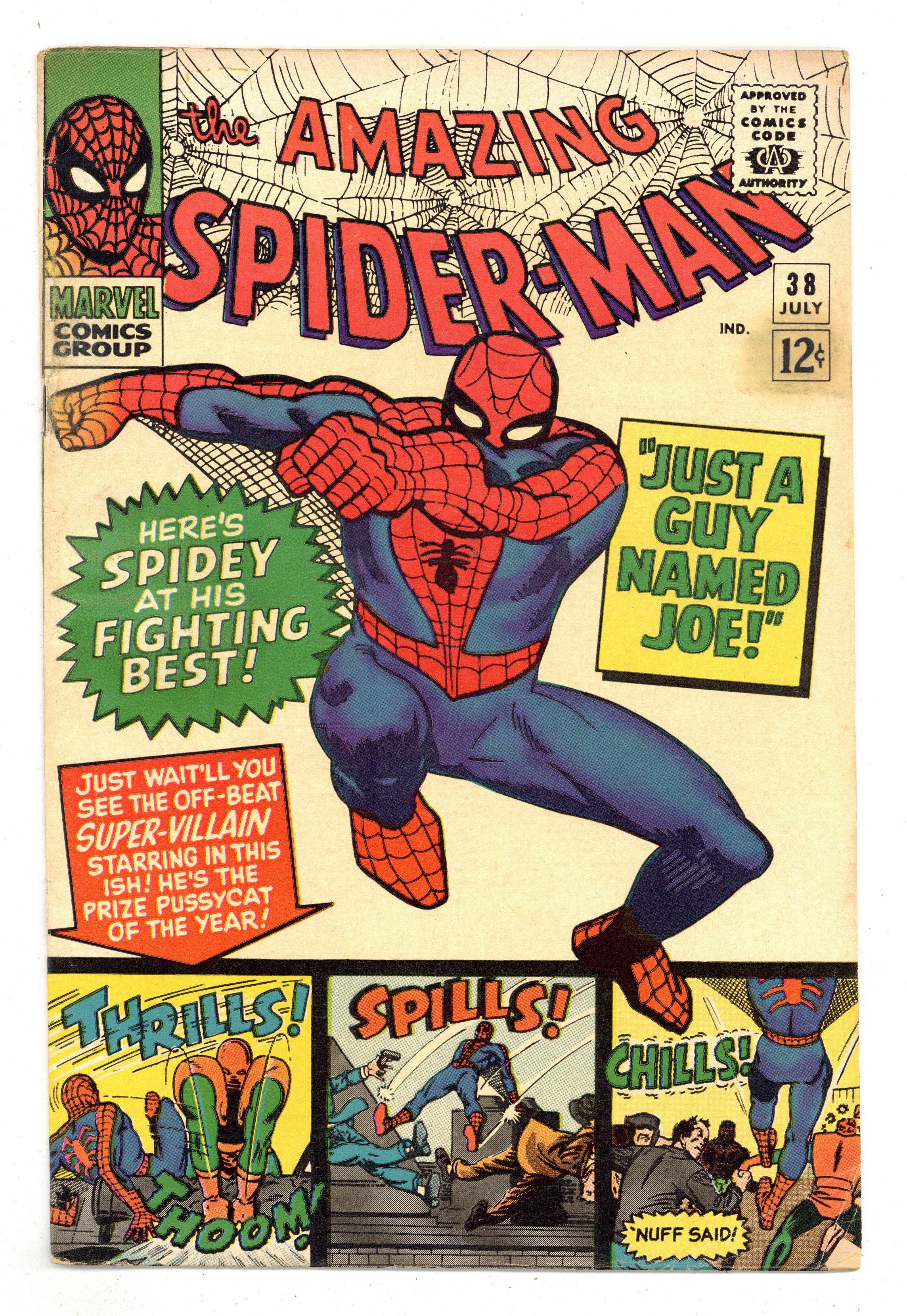 Cover art by Steve Ditko. Second appearance of Mary Jane (cameo; face not shown) in Just a Guy Named Joe!, script by Steve Ditko (Plot) and Stan Lee, art by Steve Ditko; Average joe, Joe Smith, fails at being a fighter and tries his hand at acting; Dressed up as a robotic monster, he is zapped with electricity and chemicals which causes him to go on a violent spree against those who doubted his abilities; Meanwhile, Norman Osborn puts a price on Spidey's head and our hero is plagued with goons trying to bump him off; Pete narrowly misses meeting Mary Jane. This is Ditko's final issue of Spider-Man. Reprinted in Marvel Tales # 177. 36 pgs. $0.12. Cover price $0.12. Grade: VG 4.0 explanation of grade Condition: Used (collectible)