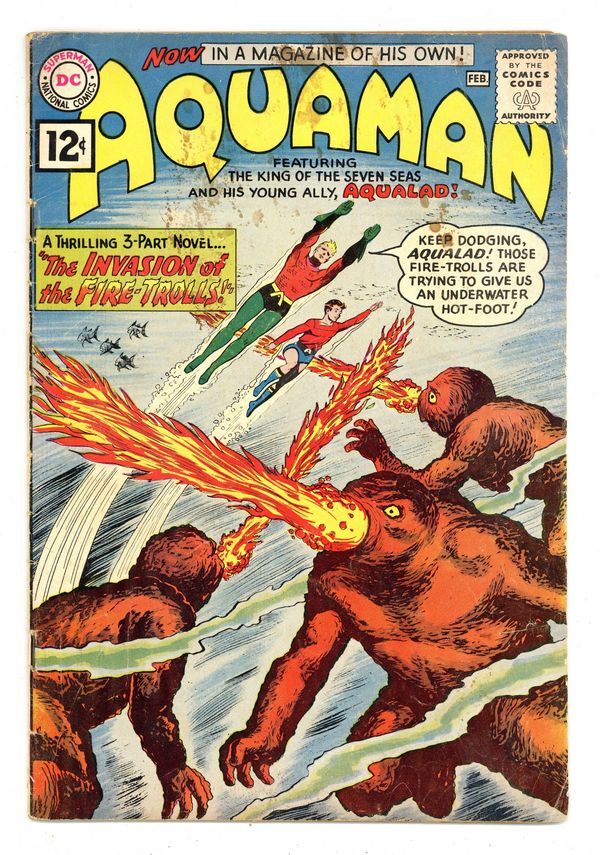 Cover art by Nick Cardy. The Invasion of the Fire Trolls, script by Jack Miller, art by Nick Cardy; Quisp helps Aquaman and Aqualad against three Fire-Trolls that escaped from an undersea volcano. Homer Goes Skin Diving humor page by Henry Boltinoff. Wonders of the Water World article. 36 pgs. $0.12. Cover price $0.12. Grade: GD+ 2.5 explanation of grade Condition: Used (collectible)