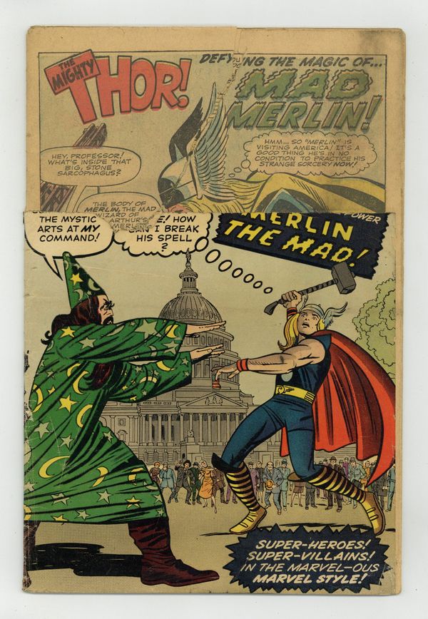Ended Dec 21 2023 Winning Bid $13 Cover pencils by Jack Kirby, inks by Sol Brodsky. "Defying the Magic of... Mad Merlin!", script by Stan Lee (plot) and Robert Bernstein (script), art by Joe Sinnott; Merlin is awakened after a thousand years and immediately decides to try and take over the world; He battles Thor using familiar Washington D.C. monuments; Jane Foster appearance; Cameos by King Arthur and his knights, John F. Kennedy, Pierre Salinger, and Caroline Kennedy. The first half of a two-page text story, "The Traveler." "Call Her...Medusa!":, script by Stan Lee (plot) and Larry Lieber (script), pencils by Larry Lieber, inks by Paul Reinman; The gorgons of myth were aliens and send an agent to modern Earth preceding an invasion. "Frederick Fenton's Future!", script by Stan Lee, art by Steve Ditko; An arrogant rich man builds a time machine in order gain the secret to eternal life from the future. 36 pgs., full color. $0.12. Cover price $0.12. Grade: PR 0.5 explanation of grade Condition: Used (collectible)