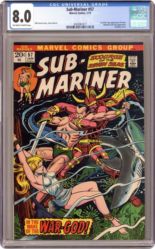 Ended Dec 31 2023 Winning Bid $30 Cover art by Bill Everett. "In the Lap of the Gods!", script and art by Bill Everett; Namor rescues a mysterious young woman from the elements during a wicked storm; Namorita calls upon Namor to help her look for her missing teacher, Prof. Vicki Starr; As it turns out, this missing teacher is more than meets the eye; She's Venus, Goddess of Love, and Ares, the God of War, has vowed to return her to Olympus; Fortunately, Namor helps Venus defeat Ares which allows her to stay on Earth and continue her efforts to promote peace. Continued from Iron Man #54. Ad for Monster Madness #1. 36 pgs., full color. $0.20. Cover price $0.20. Grade: CGC 8.0 explanation of grade Condition: Used (collectible)