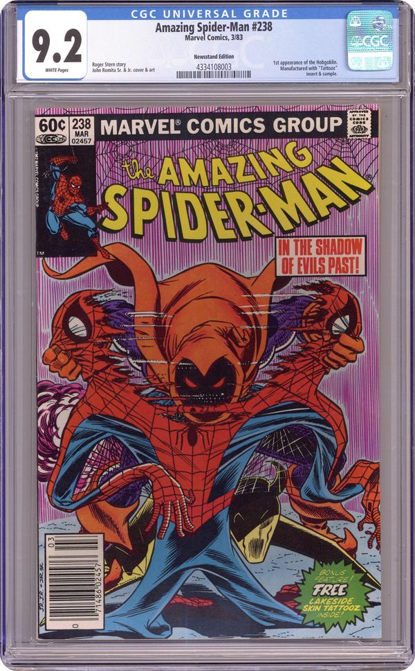 Ended Dec 18 2023 Winning Bid $396 IMPORTANT: Issue 238A HAS the Lakeside Skin Tattooz insert. Newsstand Edition. First appearance of the Hobgoblin in "Shadow of Evils Past!" Script by Roger Stern. Art by John Romita Jr. (breakdowns) and John Romita Sr. (finishes). Cover by John Romita Jr. and John Romita Sr. One of the landmark issues of the Amazing Spider-Man! And the beginning of the long secret identity mystery of the Hobgoblin! After escaping from the web-slinger, a bank robber stumbles upon an underground hideout of the (deceased) Green Goblin! Not knowing what to do with his discovery, the small-time hood shows the secret lair to an underworld associate! Unfortunately for the wondrous wall-crawler, the devious associate knows exactly what to do: resurrect the Green Goblin...with a twist! And a short time later a new super-villain is born! The Hobgoblin! Cameo appearance by Mary Jane Watson. Flashback cameo by Norman Osborn (aka the Green Goblin). (Notes: The secret identity of the original Hobgoblin takes many twists and turns over the next decade. Who actually operates as the Hobgoblin in this issue is revealed in the Spider-Man: Hobgoblin Lives (1997) Limited Series (written by Roger Stern). This issue was reprinted in Marvel Tales 257 and also in the 1992 trade paperback: the Amazing Spider-Man -- Origin of the Hobgoblin.) 36 pages. Cover price $0.60. Grade: CGC 9.2 explanation of grade Condition: Used (collectible)