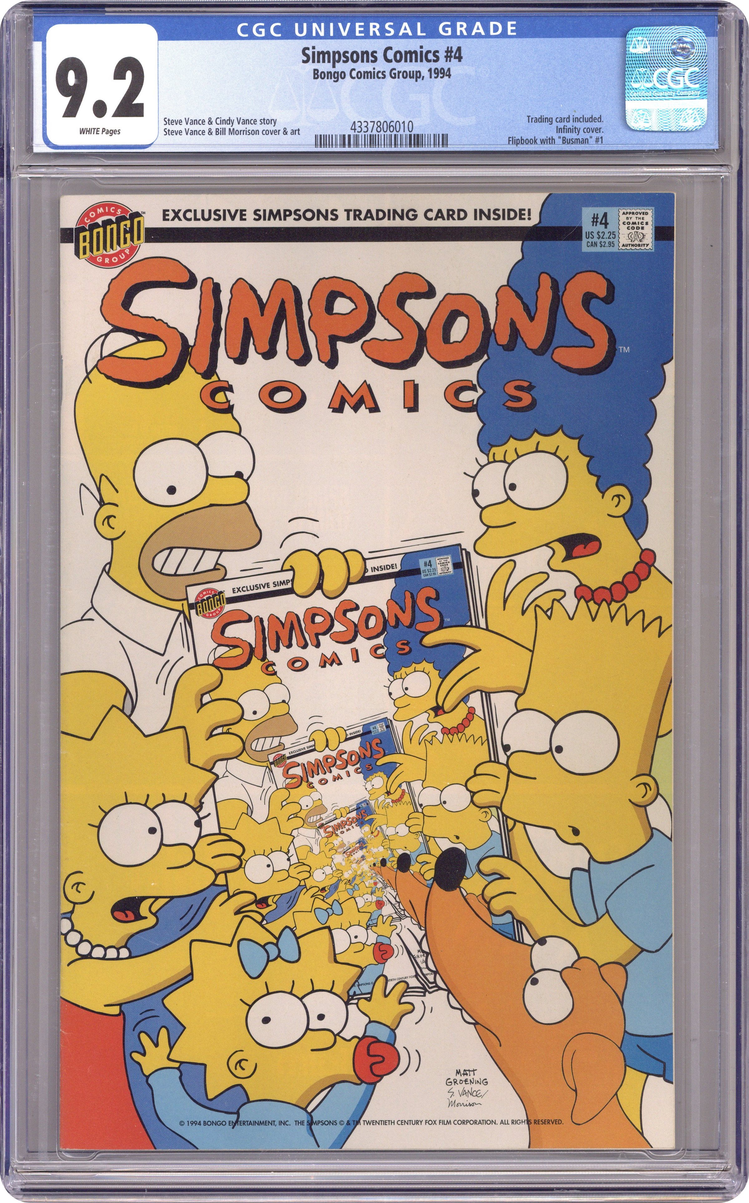 Ended Dec 27 2023 Winning Bid $28 Flip book cover. Back cover is "The Gnarly Adventures of Busman." Infinity cover. Cover pencils by Steve Vance, inks by Bill Morrison. It's in the Cards, script by Steve Vance (co-plot, script); Cindy Vance (co-plot), pencils by Steve Vance (layouts), Bill Morrison (finishes), Tim Bavington (finishes), and Phil Ortiz (assist), inks by Bill Morrison and Tim Bavington; Bart gets revenge on a baseball player who gets him and Milhouse ejected from the game. Matt Groening discusses his dislike of President Richard Milhous Nixon. Busman starring Otto, script by Steve Vance, pencils by Steve Vance (layouts) and Bill Morrison (finishes), inks by Tim Bavington. 36 pgs. $2.25. Cover price $2.25. Grade: CGC 9.2 explanation of grade Condition: Used (collectible)