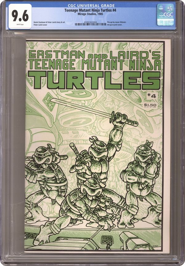 First printing. According to Overstreet, this issue has one additional printing, which can be identified as such on the inside cover. The original series that introduced the Turtles to the world. Searching for Splinter, the Turtles encounter the alien androids known as the Utroms. Story, art and cover by Kevin Eastman & Peter Laird. Final issue in magazine format; series continues in comic format as Teenage Mutant Ninja Turtles (1985). Black and white; 40 pages. Cover price $1.50. Grade: CGC 9.6 explanation of grade Condition: Used (collectible)