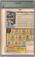 Ended Jan 25 2024 Winning Bid $305 Cover art by Jack Burnley. The Million-Dollar Marathon starring Superman, script by Don Cameron (signed as Jerry Siegel), pencils by Ed Dobrotka (signed as Joe Shuster), inks by George Roussos. The Bard of Banditry starring Vigilante, script by Don Cameron, art by Mort Meskin. Storm over the Bering starring Congo Bill, script by Joe Samachson, art by John Daly. Schickelgruber's Nightmare starring Americommando, script by Joseph Greene, art by Bernard Baily. The Riddle of the Tired Thespians starring Zatara, script by Gardner F. Fox, art by Joseph Sulman. 60 Pages, Full Color. $.10 Cover price $0.10. Grade: CGC 3.5 explanation of grade Condition: Used (collectible)