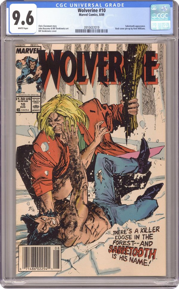 Direct Edition. "Hours!" Written by Chris Claremont. Art by John Buscema and Bill Sienkiewicz. Cover by Bill Sienkiewicz. On his birthday, Logan reflects on the murder of Silver Fox, the woman he loved, and Sabretooth, the man that murdered her! Featuring one of the earliest and most brutal battles between these two hated arch enemies. Kent Williams art on back cover (last back cover pin-up). Cover price $1.50. Grade: CGC 9.6 explanation of grade Condition: Used (collectible)