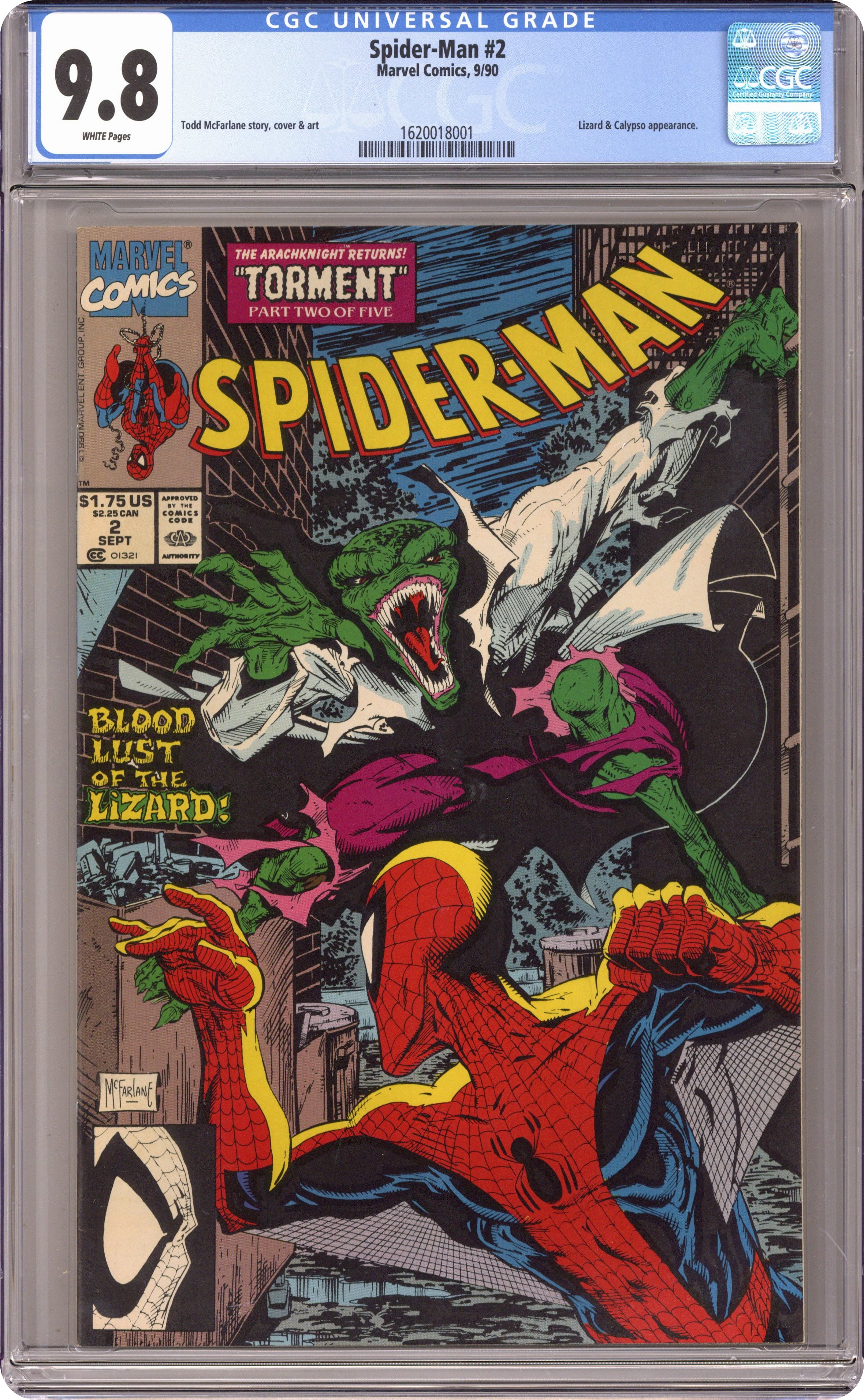 Ended Dec 12 2023 Winning Bid $42 Direct Edition. Torment Part 2 of 5. "Blood Lust of the Lizard!" Script and art by Todd McFarlane. Cover by Todd McFarlane. The gruesome killings across New York City continue unabated. And while Peter Parker is reading about them in the Daily Bugle, he notices something very disturbing in the crime scene photo on the front page. Could his long-time friend (or long-time friend's alter ego) be the bloodthirsty killer? The web-slinger begins searching for Dr. Curt Connors amid the sound of mysterious drums pounding in his head. But horrifyingly...the Lizard finds Spider-Man first! And this version of the Lethal Lizard is more savage than ever! Can the wall-crawler survive the Lizard's blindside attack? Appearance by Mary Jane Watson. (Notes: The Lizard previously appeared in Amazing Spider-Man 313. The letters page discusses the record-breaking sales of issue #1.) 32 pages. Cover price $1.75. Grade: CGC 9.8 explanation of grade Condition: Used (collectible)