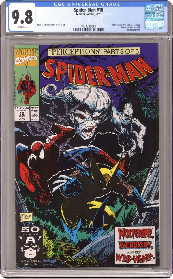 Ended Jan 7 2024 Winning Bid $45 Direct Edition. Perceptions Part 3 of 5. Guest-starring Wolverine. Script and art by Todd McFarlane. Cover by Todd McFarlane. In the middle of the woods, a group of Mounted Police runs into the Wendigo! And as expected the powerful beast savagely tears into the Mounties. But luckily for the RCMP, Wolverine isnearby! And round one between Wolverine and the Wendigo commences! After the furious fight, Logan heads into town and finds an ally: Peter Parker! Later that evening, the wall-crawler and Wolverine meet in the forest to compare notes on the case. Is it possible that the Wendigo is not responsible for the children's deaths? The plot thickens. (Note: Rob Liefeld, Jim Lee, Scott Williams, and Rick Magyar contributed inks to this issue.) 32 pages. Cover price $1.75. Grade: CGC 9.8 explanation of grade Condition: Used (collectible)