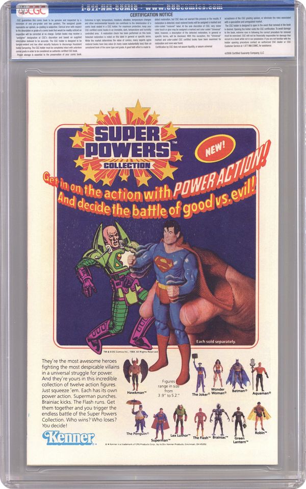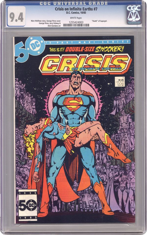 Direct Edition. "Beyond the Silent Night!" Written by Marv Wolfman. Art by George Perez, Dick Giordano, and Jerry Ordway. At last the origins of the most mysterious players in this story are revealed. Learn the secret pasts of Pariah, and why he is destined to witness world after world die, the tragic past of Harbinger, the mysterious Monitor, and evil incarnate, the Anti-Monitor. Plus, in order to stop the Anti-Monitor from destroying the last remaining Earths in the multiverse, a cadre of the DCU's most powerful heroes mount an all out assault on the villain's stronghold in the dangerous Anti-Matter Universe. It is a task not everyone will survive. Featuring the heroic and tragic death of Supergirl. Cover price $1.25. Grade: CGC 9.4 explanation of grade Condition: Used (collectible)