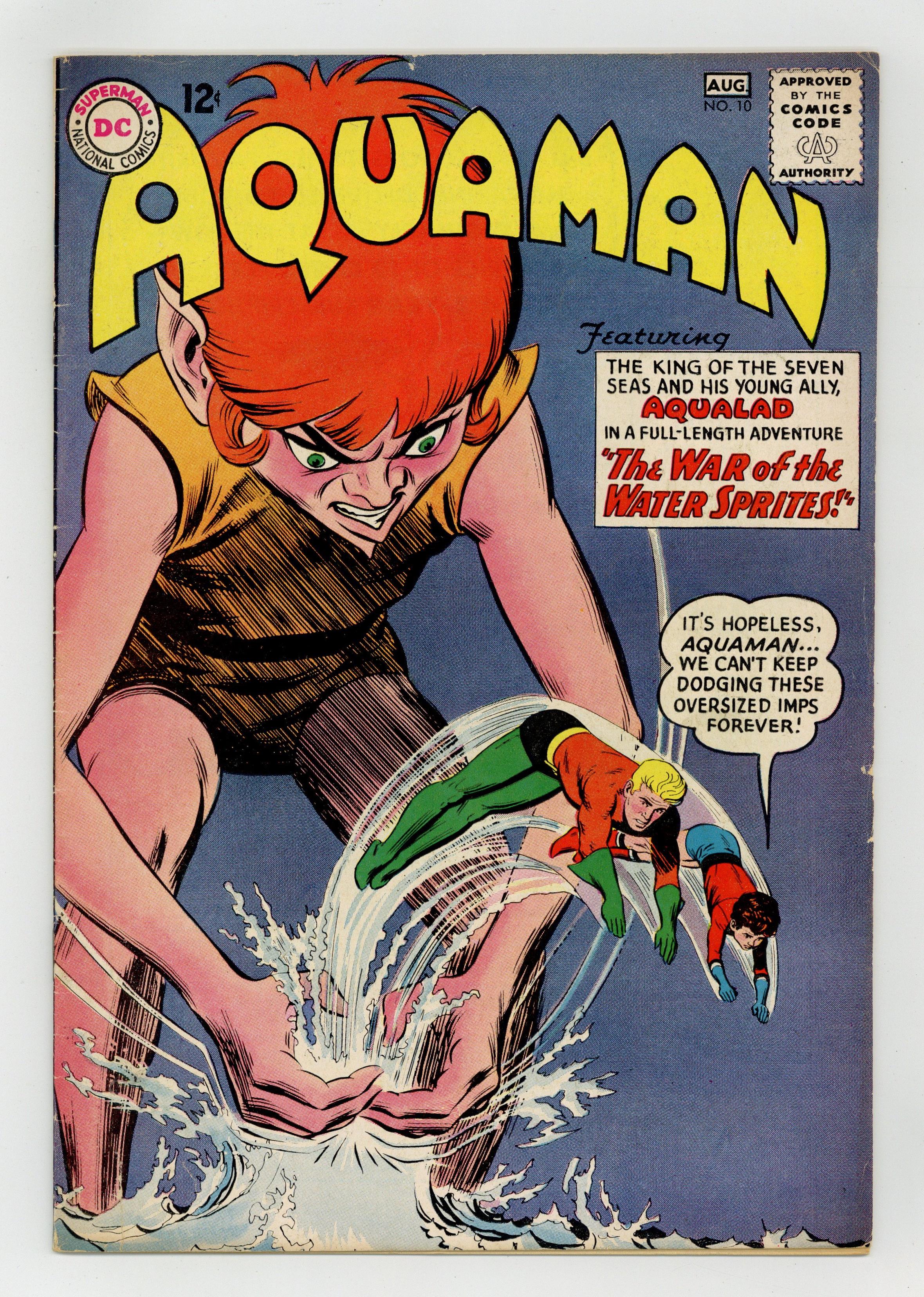 Cover art by Nick Cardy. The War of the Water Sprites, art by Nick Cardy; Aquaman goes to Quisp's home world; Quirk removes Quisp's powers; giants plan to invade the surface world. Homer the Skin Diver humor page by Henry Boltinoff. City Under the Ice article. 36 pgs. $0.12. Cover price $0.12. Grade: FN- 5.5 explanation of grade Condition: Used (collectible)