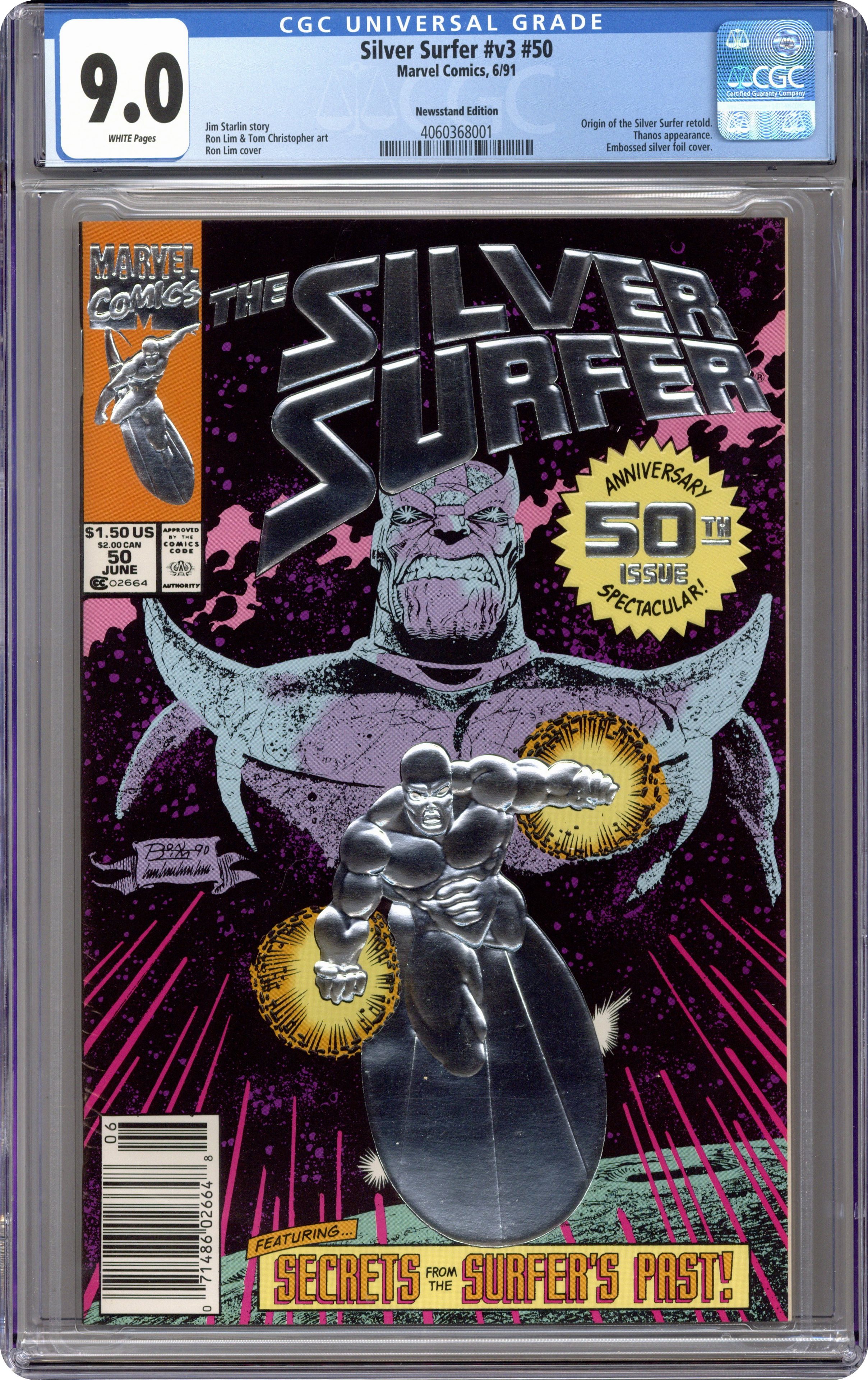 Ended Jan 29 2024 Winning Bid $28 Newstand Edition - 1st printing. Special Anniversary Issue. "Deeply Buried Secrets!" Story by Jim Starlin. Art by Ron Lim and Tom Christopher. In this 50th issue celebration the Silver Surfer fights for his life against a stone golem with all the power and visage of his arch foe Thanos. Plus, learn a dark secret from Norrin Radd's past. By story's end the Surfer plummets toward planet Earth. Broken physically and mentally, will he be able to warn Earth's heroes of the threat Thanos poses to the universe? Story continues in Infinity Gauntlet #1. 48 pages. Cover price $1.50. Grade: CGC 9.0 explanation of grade Condition: Used (collectible)