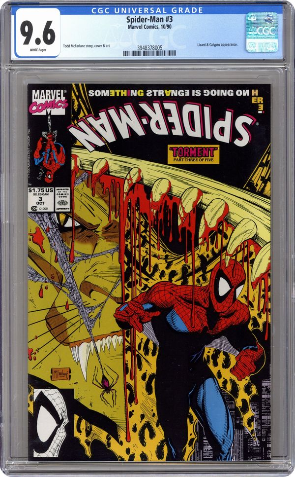 Ended Mar 12 2024 Winning Bid $27 Direct Edition. Torment Part 3 of 5. "Something Strange is Going on Here!" Script and art by Todd McFarlane. Cover by Todd McFarlane. The Amazing Spider-Man and the Lethal Lizard wage war across the rooftops of Manhattan! Until the mysterious drums halt their fight! Who is controlling the pounding drums? The web-slinger better find out soon...or he won't make it through the night in one piece! Cameo appearance by Mary Jane Watson. (Note: This five-part story was reprinted in 1992 in the trade paperback: Spider-Man Torment; and again in 2009 in hardcover format.) 32 pages. Cover price $1.75. Grade: CGC 9.6 explanation of grade Condition: Used (collectible)