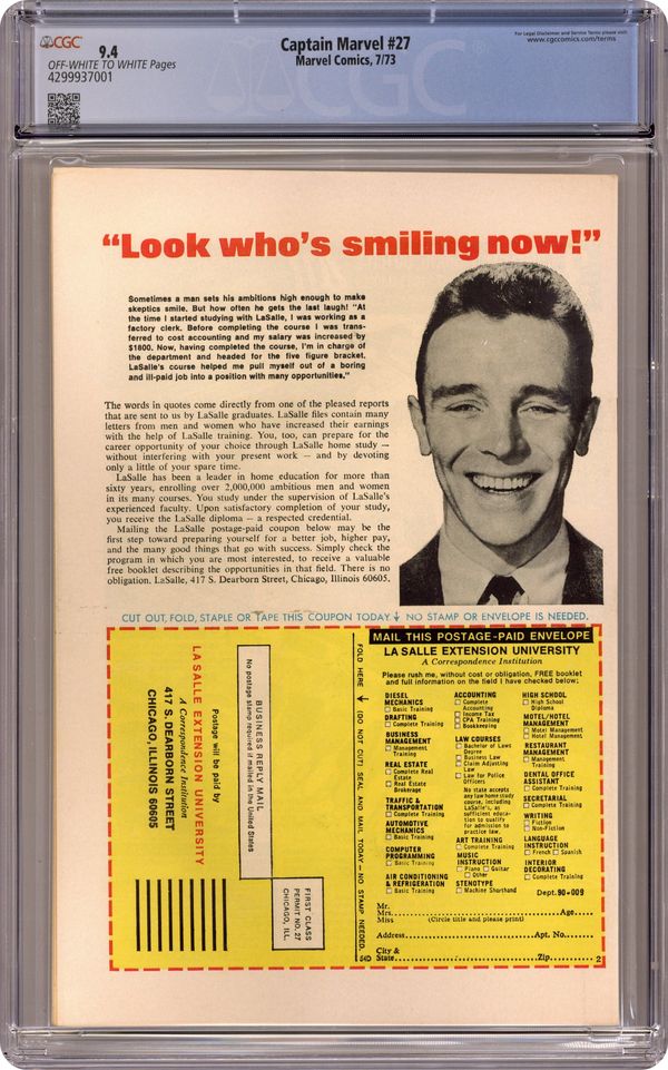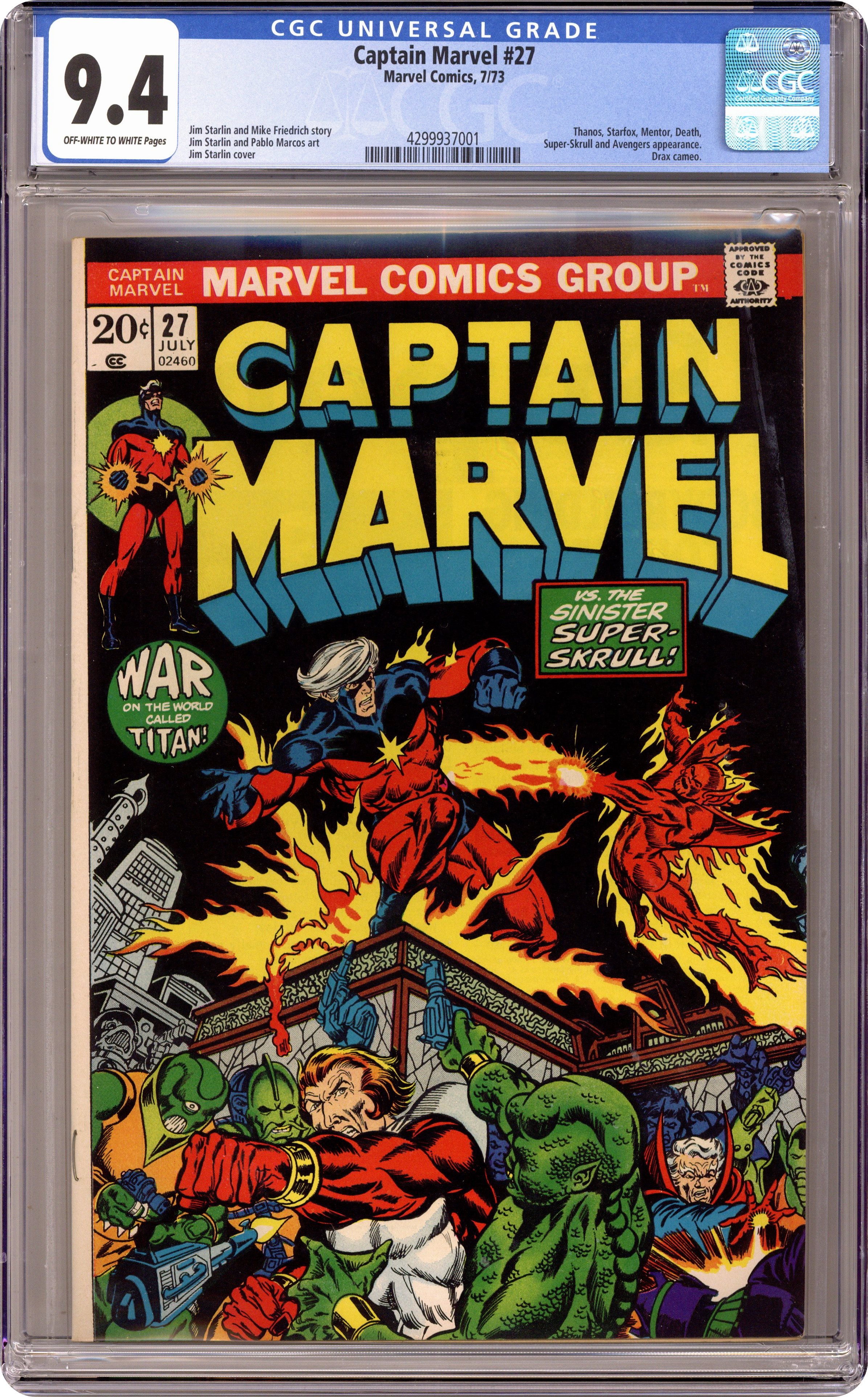 The Super-Skrull continues to pester Captain Marvel in "Trapped on Titan!" Script by Mike Friedrich, plot and pencils by Jim Starlin, inks by Pablo Marcos. Meanwhile, Thanos seeks out the Cosmic Cube. Cameos by the Thing (of the Fantastic Four), the Avengers (Captain America, Iron Man, the Scarlet Witch, the Vision, and the Black Panther), and Drax the Destroyer. This issue also contains a map of Titan. Cover price $0.20. Grade: CGC 9.4 explanation of grade Condition: Used (collectible)