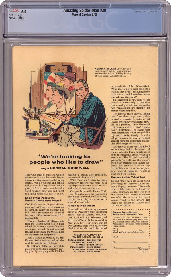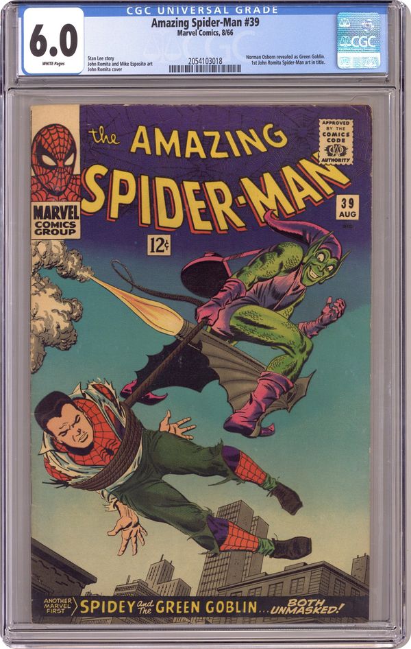 Cover art by John Romita. How Green Was My Goblin!, script by Stan Lee, pencils by John Romita (who begins as regular penciler), inks by Mike Esposito [as Mickey Demeo] and John Romita (touch-ups); Peter heads to the doctor with the sniffles and learns that Aunt May's health is very fragile; Spidey is roped into tangling with a bunch of goons who zap him with a mysterious gas; Not realizing that the gas has weakened his spider sense, he changes into Peter Parker under the watchful gaze of the Green Goblin; The Goblin confronts Spidey outside of his home and captures him as Peter is worried that Aunt May might be overcome by the commotion; Trussed up in the Goblin's lair, Peter is shocked when the Goblin takes off his mask and reveals himself to be Norman Osborn. Reprinted in Marvel Tales # 178. According to Les Daniels in "Marvel: Five Fabulous Decades of the World's Greatest Comics" (Abrams, 1991), artist Steve Ditko resigned because of a disagreement over the Goblin's identity. Ditko wanted it to be someone anonymous--a new, unknown guy; Lee wanted it to be a familiar character that would startle readers. 36 pgs. $0.12. Cover price $0.12. Grade: CGC 6.0 explanation of grade Condition: Used (collectible)