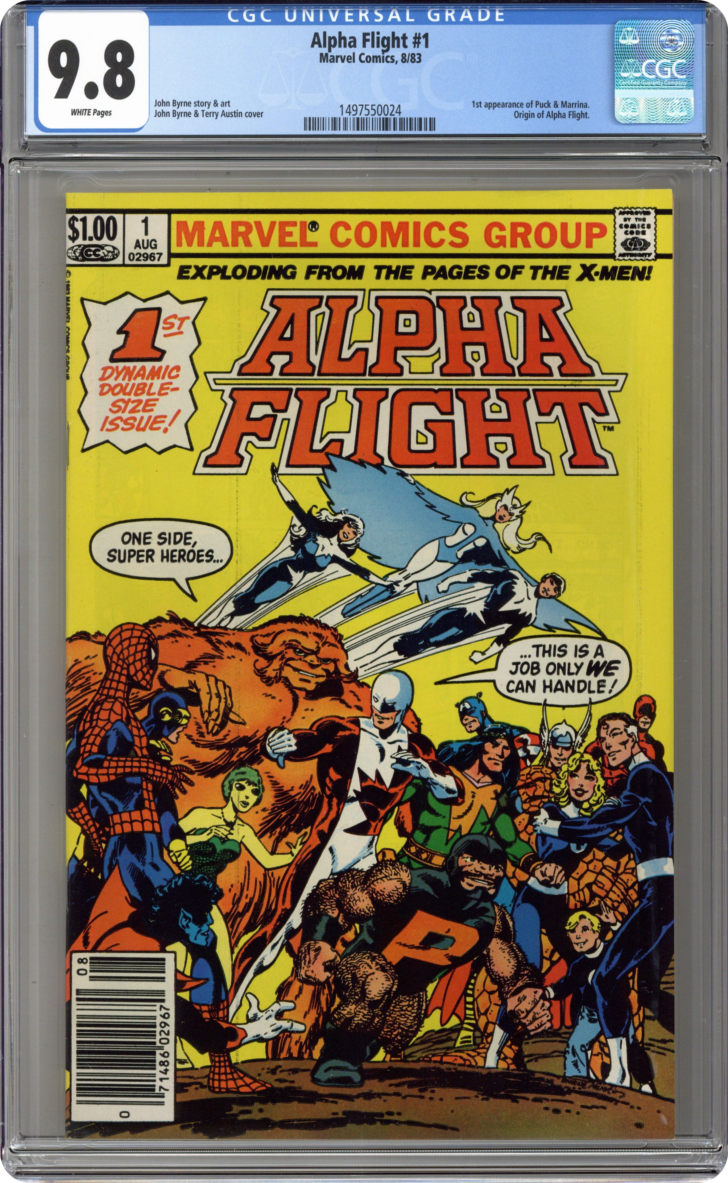 Direct Edition. "Tundra!" Story and art by John Byrne. Exploding from the pages of the X-Men comes Canada's premier super-team - Alpha Flight! The monstrous Sasquatch, the mystical Shaman, the twins, Aurora and Northstar, the divine Snowbird, the tumbling Puck (1st appearance), the aquatic beauty, Marrina (1st appearance), and their leader, Vindicator, must reunite to stop the destructive elemental force known as Tundra. NOTE: Also 1st appearance of Omega Flight (Diamond Lil, Wild Child, Flashback,& Smart Alec). Cover price $1.00. Grade: CGC 9.8 explanation of grade Condition: Used (collectible)