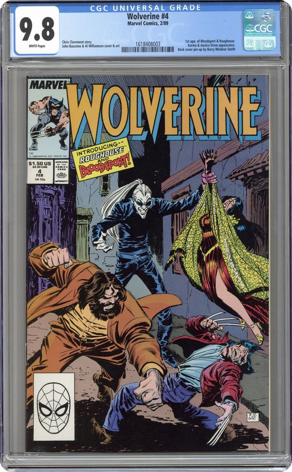 Direct Edition. "Bloodsport!" Written by Chris Claremont. Art and Cover by John Buscema and Al Williamson. Back Cover by Barry Windsor-Smith. Tyger Tiger, head of Mandripoor's crime scene, is being harassed by enemy assassins, Roughhouse and Bloodsport. Naturally Wolverine is there to save her. 32 pages, FC Cover price $1.50. Grade: CGC 9.8 explanation of grade Condition: Used (collectible)