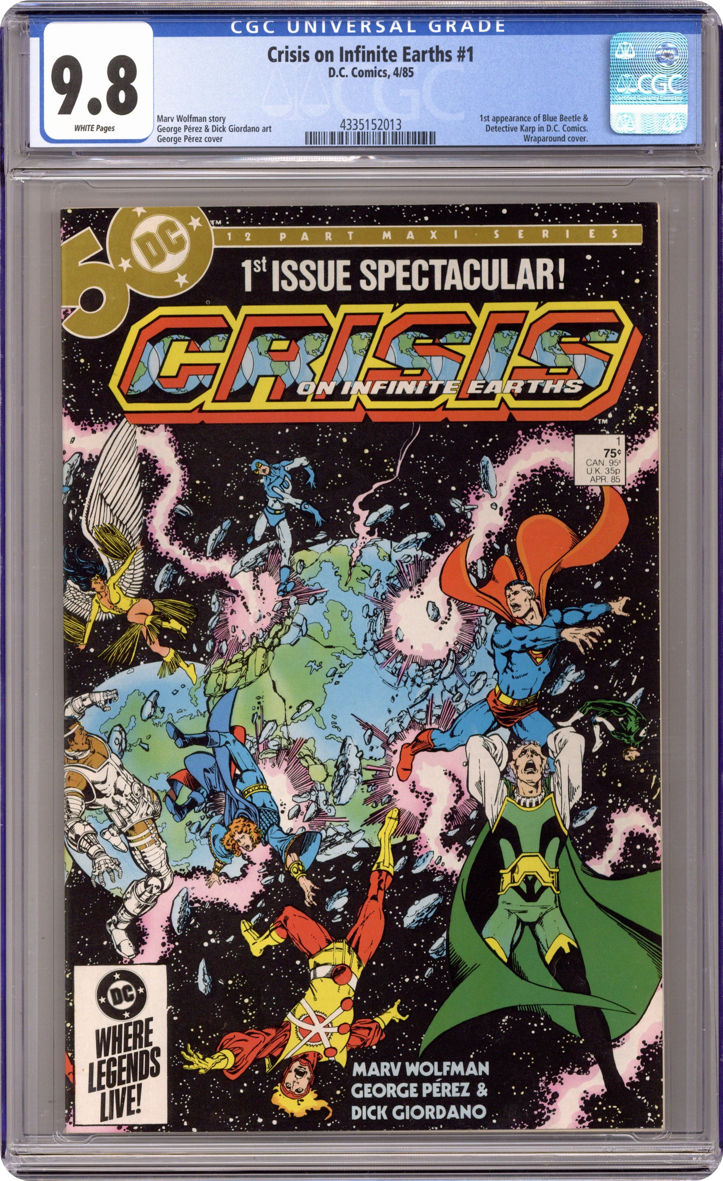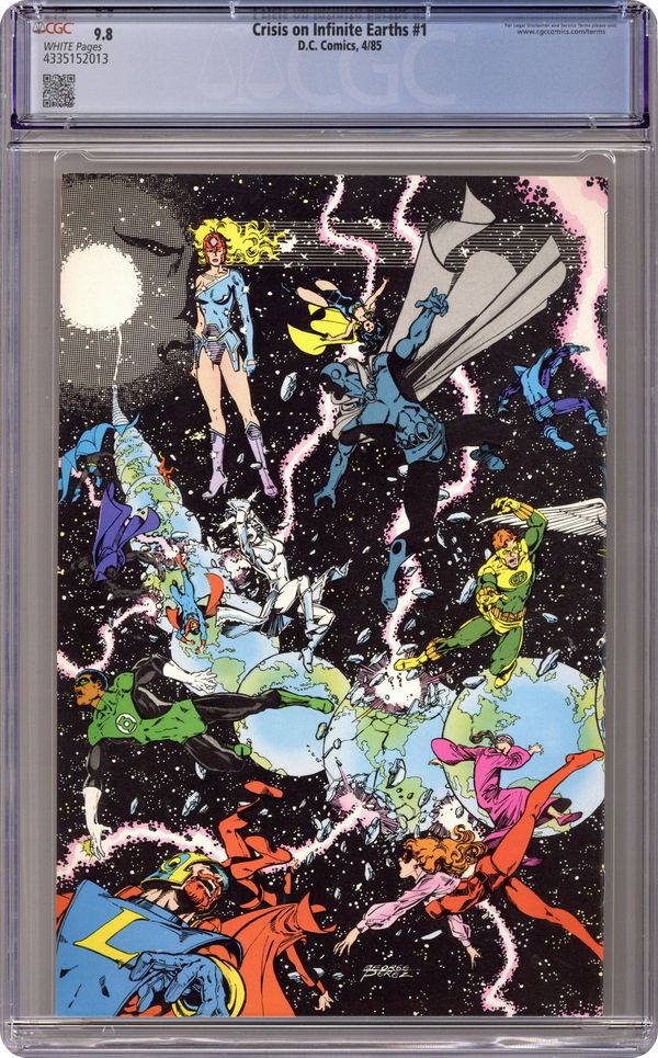 Direct Edition. "The Summoning!" Written by Marv Wolfman. Art by George Perez and Dick Giordano. This is it, the biggest, and arguably most important, event in the history of the DCU. A wave of unstoppable destructive force is sweeping across the multiverse and indiscriminately destroying everything in its path. Nothing seems able to stop it. The Crime Syndicate of Amerika (evil versions of the JLA) of Earth-3 die trying, along with their world. Batman receives an ominous warning from the Flash. Weather and natural disasters are out of control. An eclectic group of heroes and villains from around the multiverse are assembled to halt the death and destruction, and the being known as the Monitor may be the only one who can help them. 1st appearance of Alexander Luthor. Featuring the deaths of the Crime Syndicate of Amerika and Lex Luthor of Earth-3. NOTE: What can I say about "Crisis" accept that it's epic, meaningful, engrossing, and grand in scope. As an eleven year old comic fan, I remember being absolutely blown away by this story. Marv Wolfman and George Perez are truly masters of their craft. - Odinson, Lone Star Comics Archivist Cover price $0.75. Grade: CGC 9.8 explanation of grade Condition: Used (collectible)
