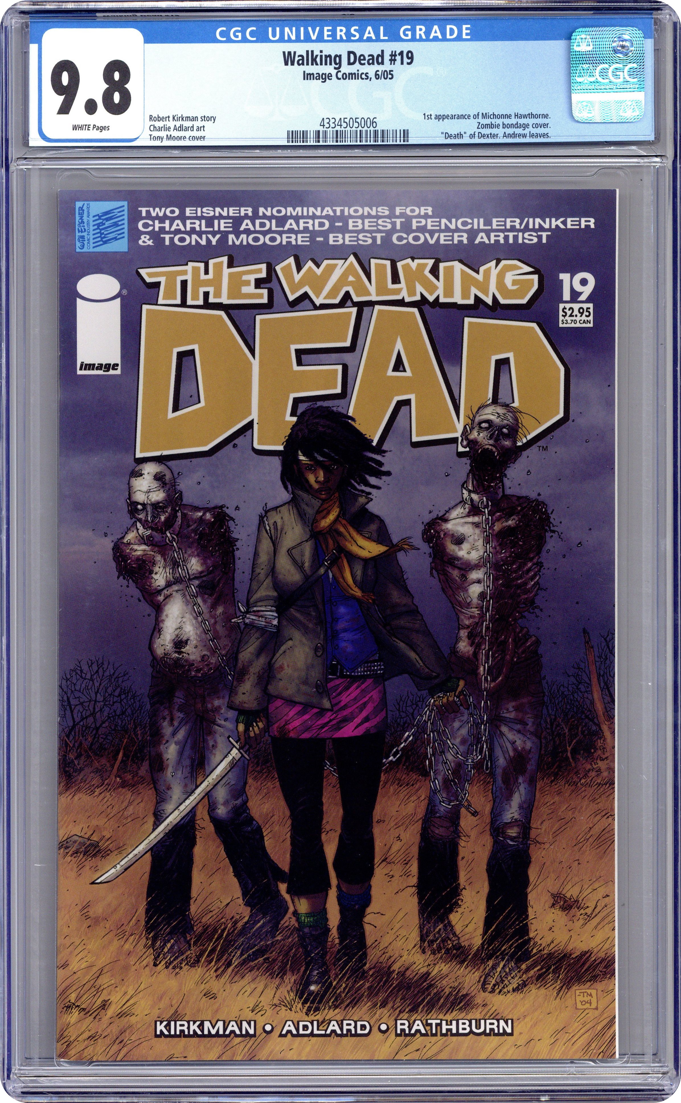 Ended Dec 19 2023 Winning Bid $345 First appearance of Michonne. Zombie bondage cover. Written by ROBERT KIRKMAN, art by CHARLIE ADLARD, and cover by TONY MOORE. The group has a visitor, but is she friend, foe or worse? Where did she come from? How did she survive? Can she be trusted? This is the beginning of a new story arc, an excellent jumping-on point for new readers. The quest to rebuild civilization starts here. Cover price $2.95. Grade: CGC 9.8 explanation of grade Condition: Used (collectible)