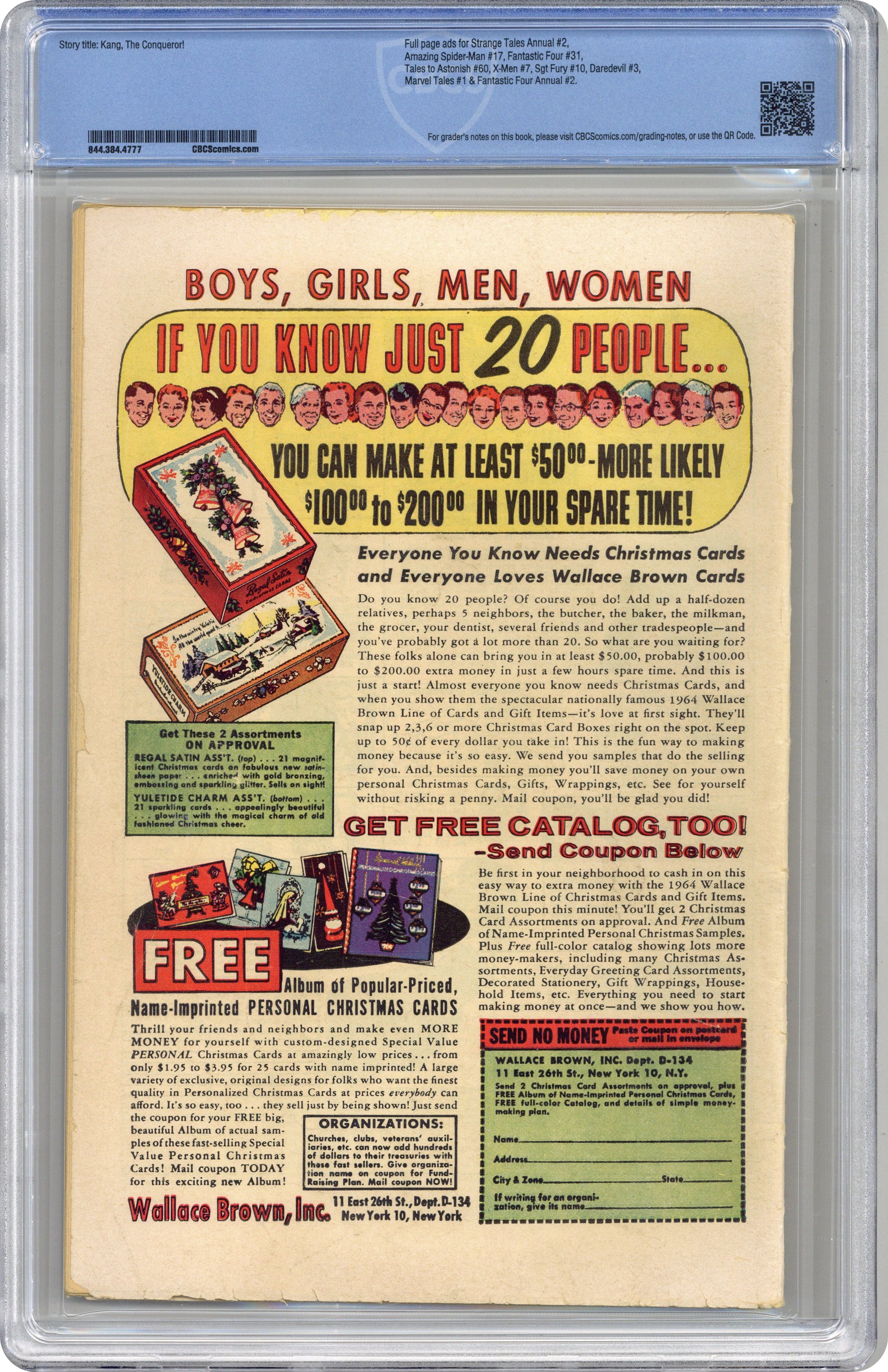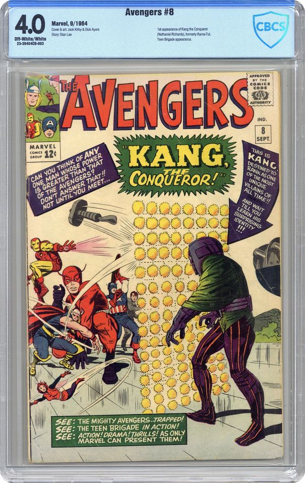 Cover pencils by Jack Kirby, inks by Dick Ayers. Kang, The Conqueror!, script by Stan Lee, pencils by Jack Kirby, inks by Vince Colletta cover; Kang appears and demands to be made ruler of the Earth; The Avengers attempt to stop him, but it comes down to Wasp and the Teen Brigade to slow Kang long enough for the rest of the Avengers to free themselves and put an end to Kang's threat. Roster: Captain America, Thor, Iron Man, Wasp, Giant-Man, and Rick Jones. First appearance of Kang. 36 pgs. $0.12. Cover price $0.12. Grade: CBCS 4.0 explanation of grade Condition: Used (collectible)