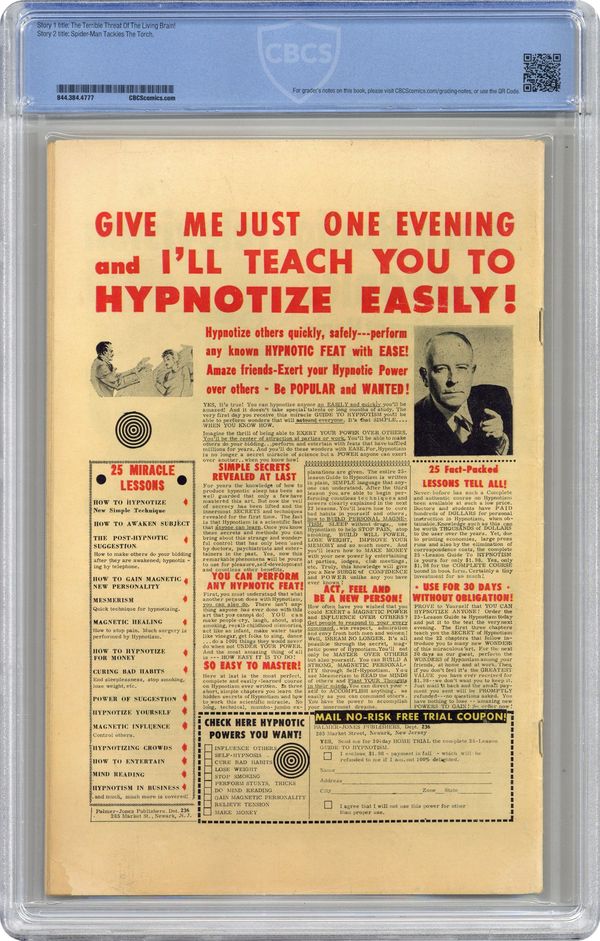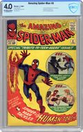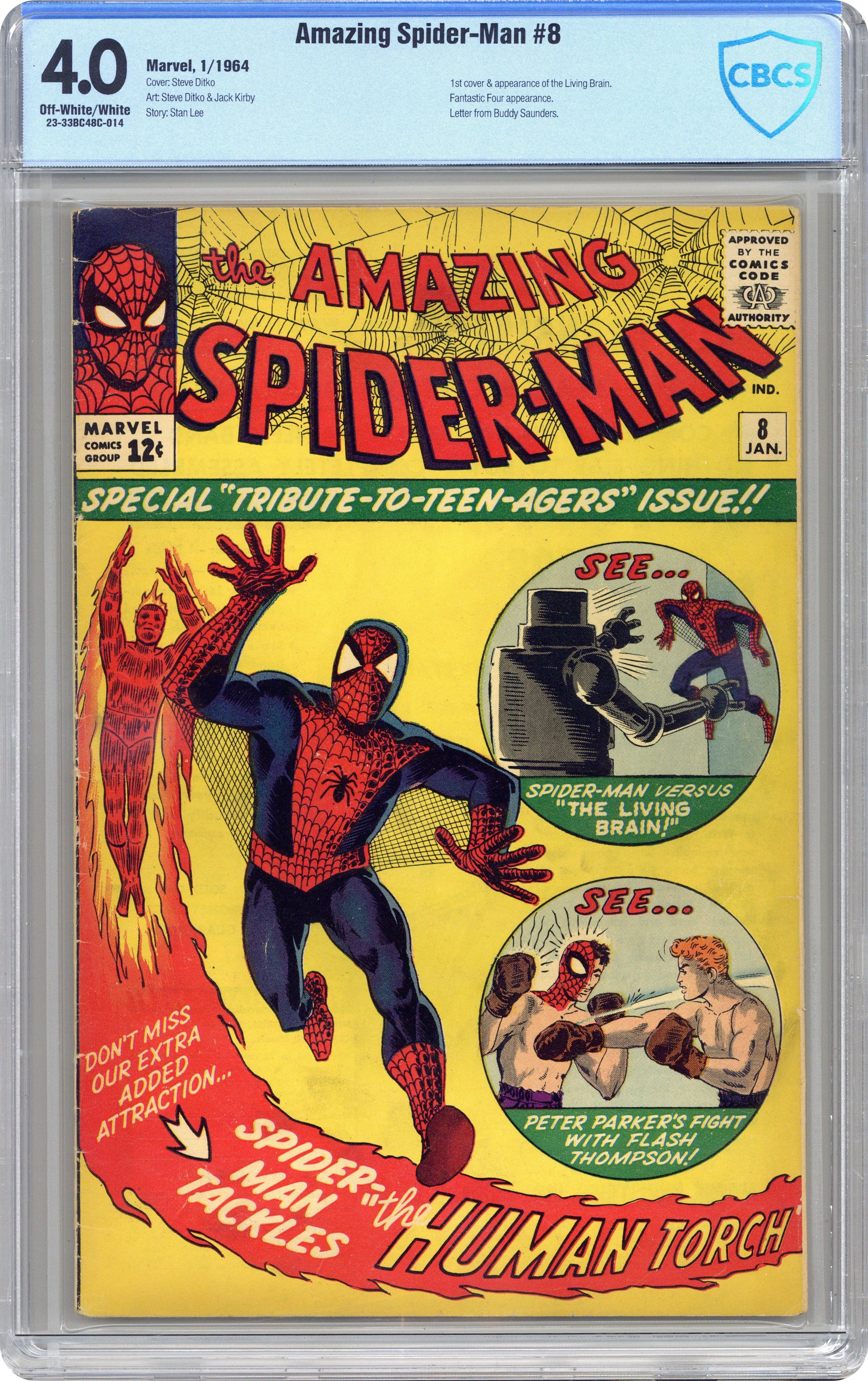 Cover art by Steve Ditko. First appearance of Mr. Petty (inventor of the Living Brain) in The Terrible Threat of the Living Brain!, script by Stan Lee, art by Steve Ditko; When two technicians try to steal a computer that is on display at Peter's school, they accidentally turn it into "The Living Brain" that goes wild and must be stopped by Spider-Man. Reprinted in Marvel Tales # 5 and #145. Spider-Man Tackles The Torch!, script by Stan Lee, pencils by Jack Kirby, inks by Steve Ditko; Spider-Man crashes a party at Johnny Storm's girlfriend's place, causing a fight between the Human Torch and Spider-Man that soon escalates to include the rest of the Fantastic Four. Letter to the editor from Buddy Saunders, president of MyComicShop, written to Marvel in his callow youth. 36 pgs. $0.12. Cover price $0.12. Grade: CBCS 4.0 explanation of grade Condition: Used (collectible)