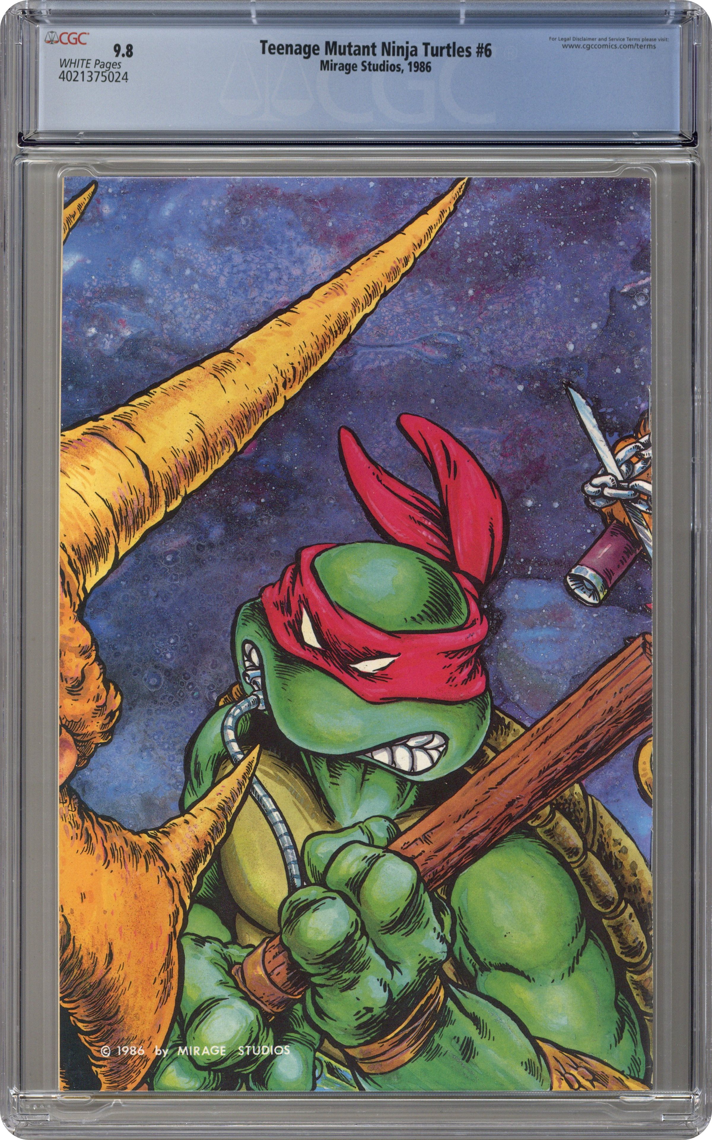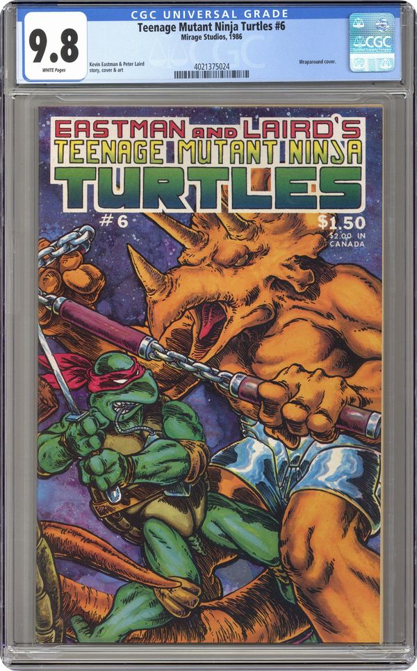 The original series that introduced the Turtles to the world. The Turtles must fight for their lives against Triceraton warriors in a space arena. Story, art and cover by Kevin Eastman & Peter Laird. Black and white; 32 pages. Cover price $1.50. Grade: CGC 9.8 explanation of grade Condition: Used (collectible)
