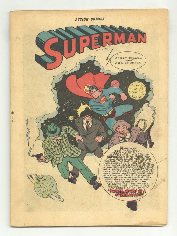 Cover art by Jack Burnley. There'll Always Be a Superman, script by Don Cameron (signed as Jerry Siegel), art by Ed Dobrotka (signed as Joe Shuster). The Crime Carnival starring The Vigilante, script by Don Cameron, art by Mort Meskin. The Loyal Traitor starring Three Aces, script by Gardner F. Fox, art by Louis Cazeneuve. The Blitz Barge starring Americommando, script by Joseph Greene, art by Bernard Baily. Island of Peril starring Congo Bill, art by Edwin Smalle. The Money Buyer starring Zatara, script by8 Gardner F. Fox, art by Joseph Sulman. 60 Pages, Full Color. $.10 Cover price $0.10. Grade: Coverless explanation of grade Condition: Used (collectible)