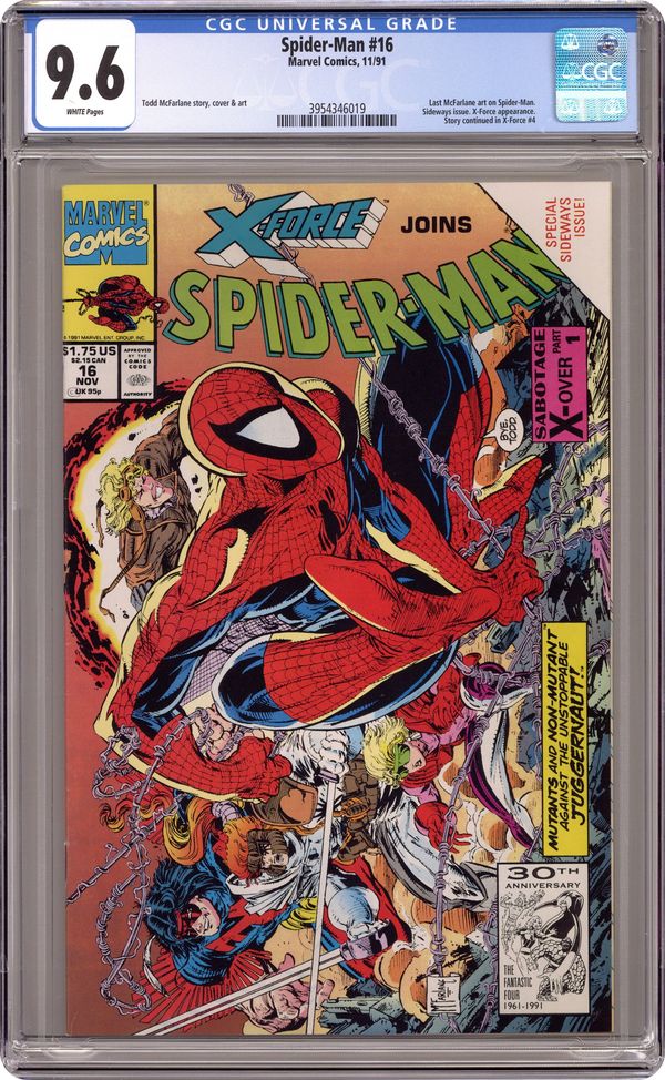 Ended Mar 15 2024 Winning Bid $26 Direct Edition. X-Force crossover. "Sabotage" Part 1 of 2. Guest-starring X-Force. Script and art by Todd McFarlane. Plot assist by Rob Liefeld. Cover by Todd McFarlane. Plot continues from X-Force (1st series) #3. Superstar artist Todd McFarlane's spectacular run on the Spider-Man (1990) title comes to an end with a battle royal on the streets of lower Manhattan! The wall-crawler is web-swinging by the World Trade Center...when he stumbles across a major battle in progress between X-Force and the Juggernaut! Spider-Man knows Cain Marko is nigh unstoppable, but the youngsters of X-Force don't care! Can the web-slinger guide them to victory? Story concludes in X-Force #4. X-Force Lineup: Boom-Boom, Cable, Cannonball, Domino, Feral, Gideon, Shatterstar, Siryn, Sunspot, and Warpath. (Notes: This unique issue is drawn in widescreen/landscape format (horizontal) to maximize the action -- in the same manner as Fantastic Four 252. After this issue Todd McFarlane left Marvel and formed Image Comics with other superstar artists (Jim Lee, Marc Silvestri, and Erik Larsen to name a few). There he created Spawn -- one the most successful creator-owned characters in the history of the medium. Spawn has inspired spin-offs, cartoons, a movie, and one of the most successful toy lines of all time. - Odinson, Lone Star Archivist.) 32 pages. Cover price $1.75. Grade: CGC 9.6 explanation of grade Condition: Used (collectible)