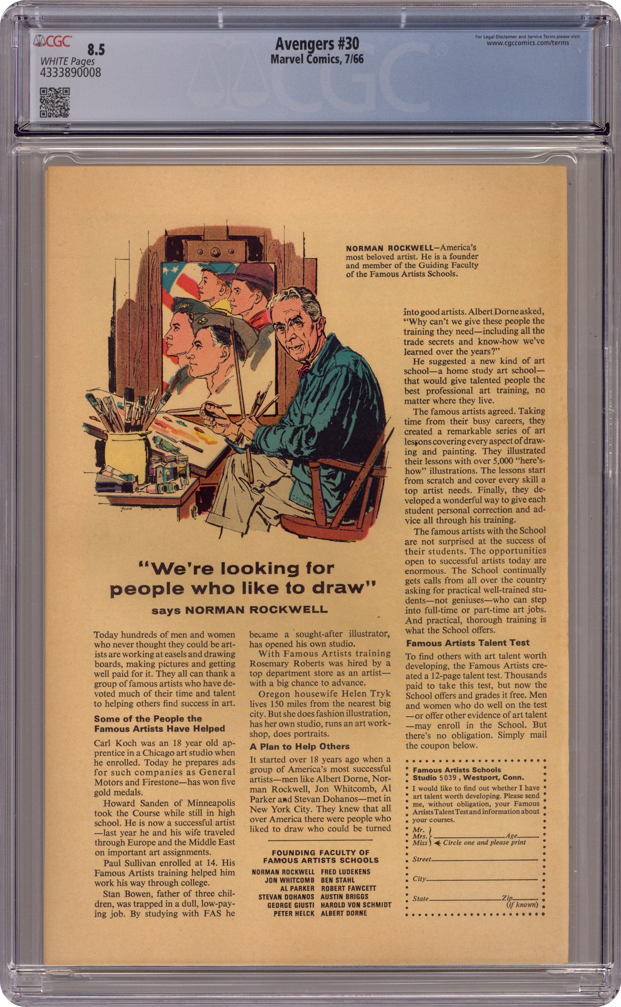Ended Jan 1 2024 Winning Bid $106 Cover pencils by Jack Kirby, inks by Frank Giacoia. "Frenzy in a Far-Off Land," script by Stan Lee, pencils by Don Heck, inks by Frank Giacoia; Quicksilver and the Scarlet Witch take a leave of absence from the Avengers due to their dwindling powers; Goliath also sets off to South America to try and find a cure, hearing his old college professor Dr. Anton is there; Black Widow is ordered to destroy the Avengers again with the help of the Swordsman and Power Man; The Avengers find the Black Widow and co. but Hawkeye wants to go alone, as it is personal to him; Meanwhile, Goliath lands in South America and finds Dr. Anton has been captured by the Keeper of the Flame; He tries to save him, but is overwhelmed then brought to safety by Prince Rey, who leads a rebel force against the Keeper; Hawkeye defeats the Swordsman but is trapped by Power Man; The Black Widow saves him, finding herself unable to harm Hawkeye as she loves him; Captain America and the Wasp leave to help Goliath. Avengers roll call: Captain America, Hawkeye, Goliath, the Wasp, and, briefly, Quicksilver and the Scarlet Witch. 36 pgs., full color. $0.12. Cover price $0.12. Grade: CGC 8.5 explanation of grade Condition: Used (collectible)