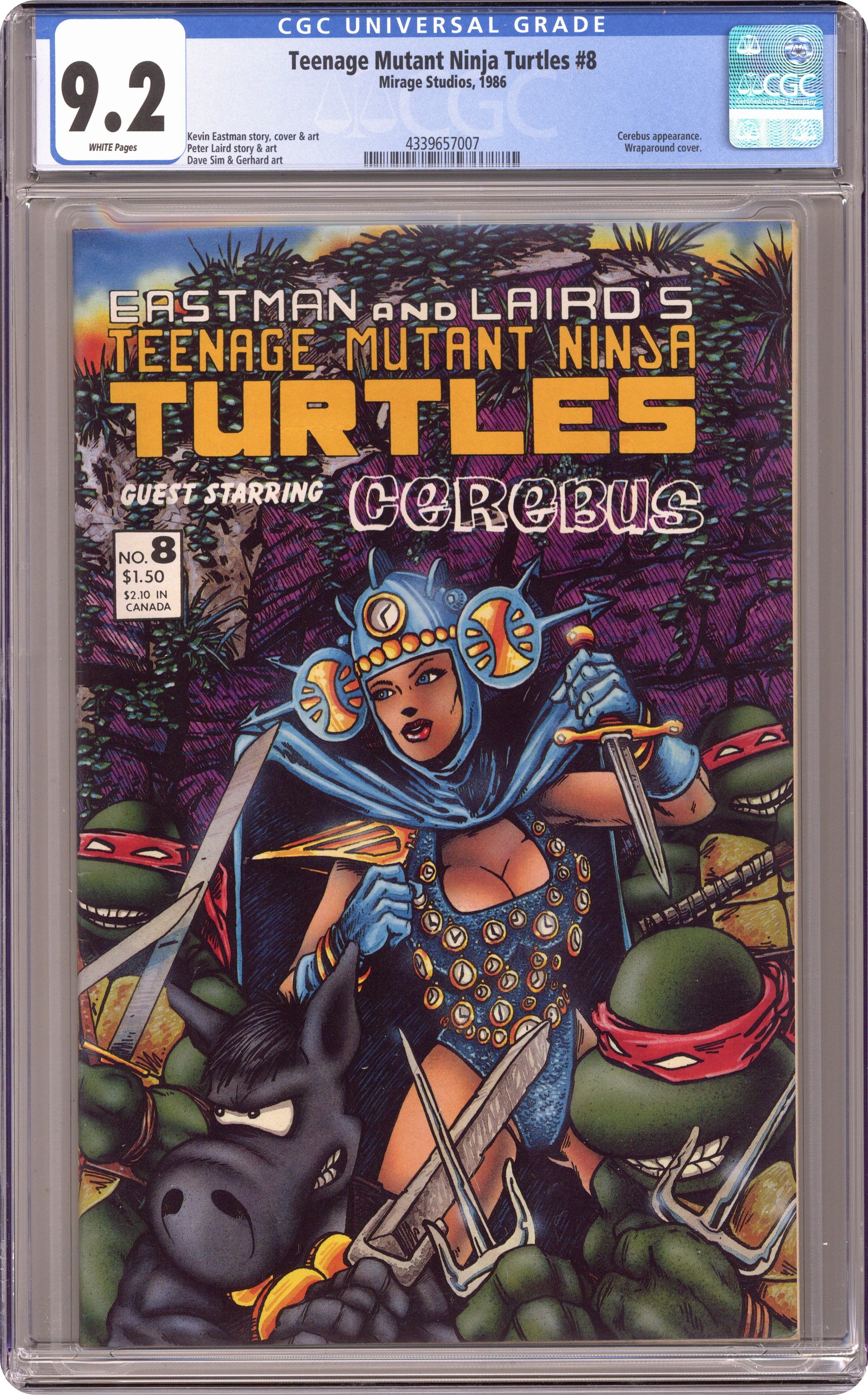 Ended Jan 30 2024 Winning Bid $24 The original series that introduced the Turtles to the world. An errant time traveler accidentally sends the Turtles and herself through time, where they meet Dave Sims Cerebus the Aardvark. Story, art and cover by Dave Sim, Kevin Eastman & Peter Laird; backgrounds by Gerhard. Black and white; 32 pages. Cover price $1.50. Grade: CGC 9.2 explanation of grade Condition: Used (collectible)