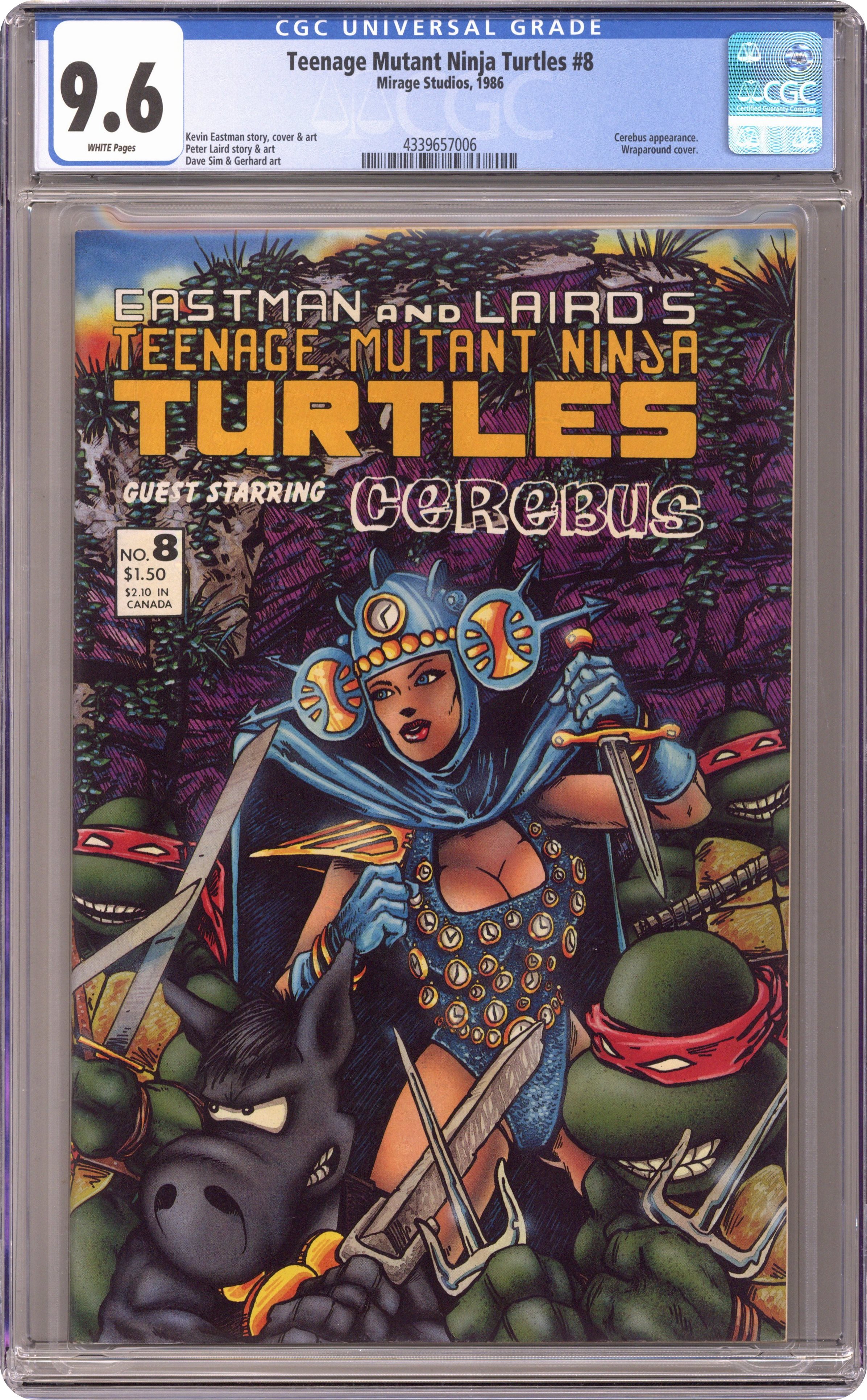 Ended Jan 30 2024 Winning Bid $45 The original series that introduced the Turtles to the world. An errant time traveler accidentally sends the Turtles and herself through time, where they meet Dave Sims Cerebus the Aardvark. Story, art and cover by Dave Sim, Kevin Eastman & Peter Laird; backgrounds by Gerhard. Black and white; 32 pages. Cover price $1.50. Grade: CGC 9.6 explanation of grade Condition: Used (collectible)