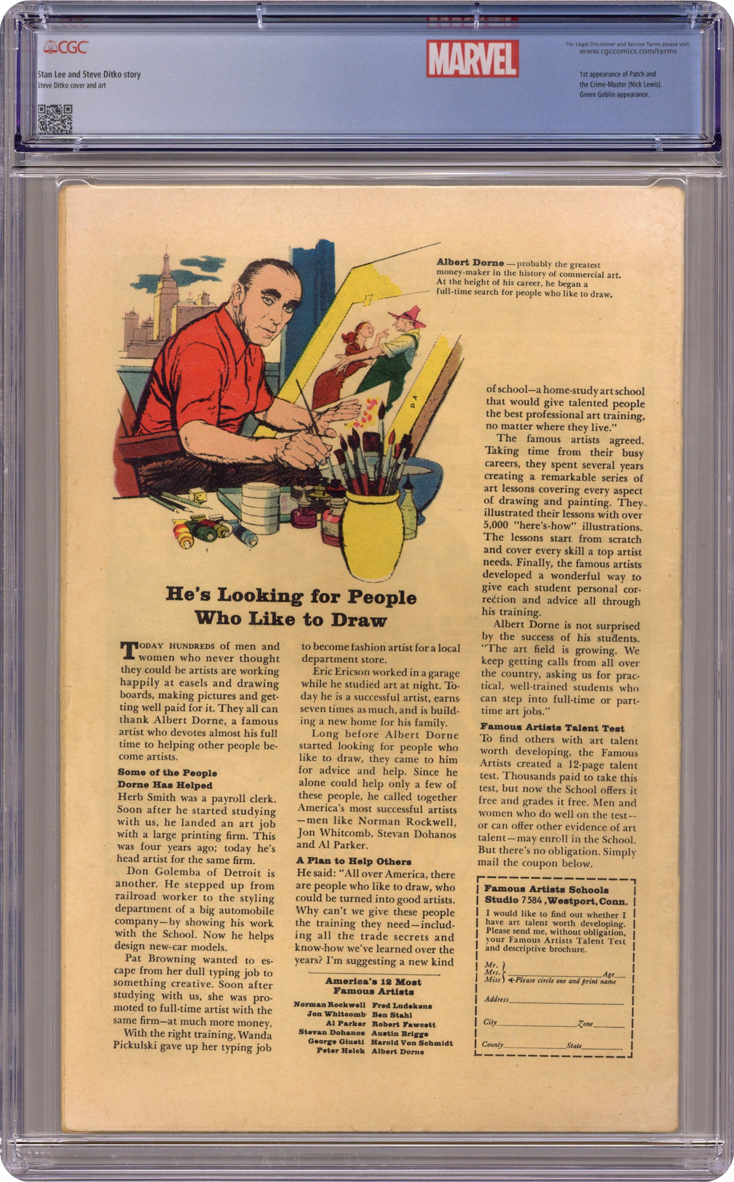 Ended Jan 30 2024 Winning Bid $106 Cover art by Steve Ditko. Fourth appearance of the Green Goblin and first appearance of the Crime Master in The Man In The Crime-Master's Mask, script by Steve Ditko (plot) and Stan Lee (script), art by Steve Ditko; Spider-Man battles the Crime-Master and the Green Goblin. Reprinted in Marvel Tales # 21 and 164. Letter to the editor from comics writer Steve Gerber. 36 pgs. $0.12. Cover price $0.12. Grade: CGC 4.0 explanation of grade Condition: Used (collectible)