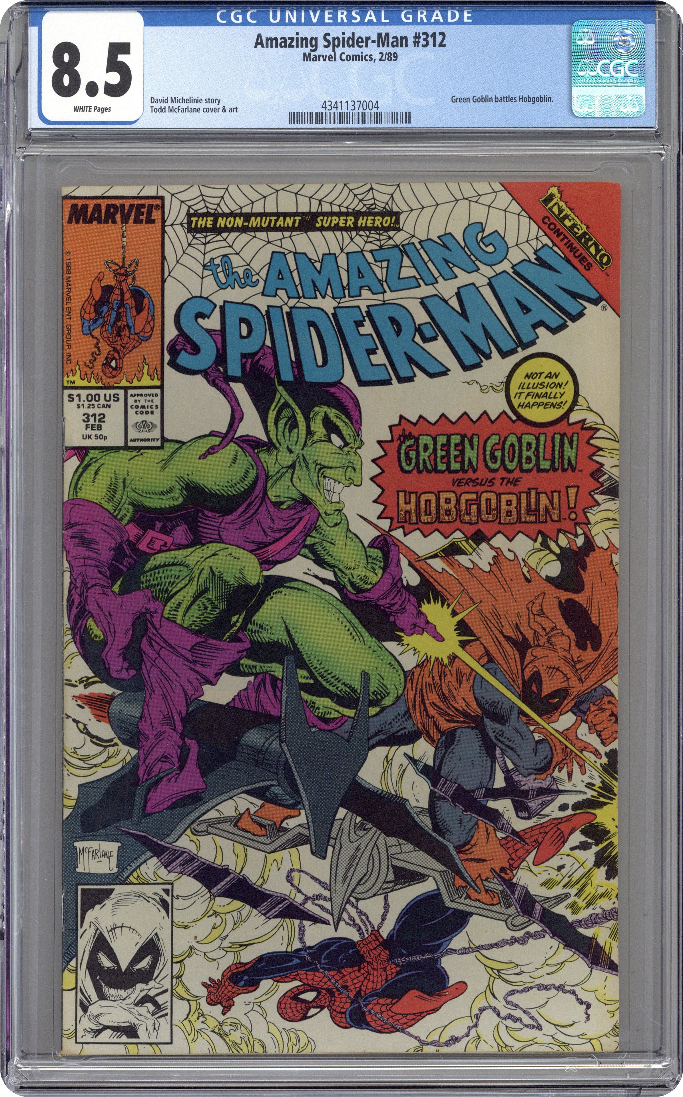 Ended Dec 26 2023 Winning Bid $16 Direct Edition. "The Goblin War!" Inferno crossover. Script by David Michelinie. Art by Todd McFarlane. Cover by Todd McFarlane. Story continues from Web of Spider-Man 47. With his family in danger, the Green Goblin rides again! Oh my, does Harry know what he's doing by challenging the might of the Hobgoblin? In the skies above the Osborn Chemical Company, the pumpkin bombs fly as the goblins clash! And naturally your friendly neighborhood Spider-Man is caught in the middle! Meanwhile the effects of Inferno begin affecting Dr. Curt Connors. Uh-oh, could an appearance from the Lethal Lizard be in the near future? Yesss! Story continues in Spectacular Spider-Man 147. Cameo appearances by Mary Jane Watson, Liz Osborn, and J. Jonah Jameson. (Note: Harry Osborn dons the garb of the Green Goblin for the first time since Amazing Spider-Man 180.) 36 pgs. Cover price $1.00. Grade: CGC 8.5 explanation of grade Condition: Used (collectible)