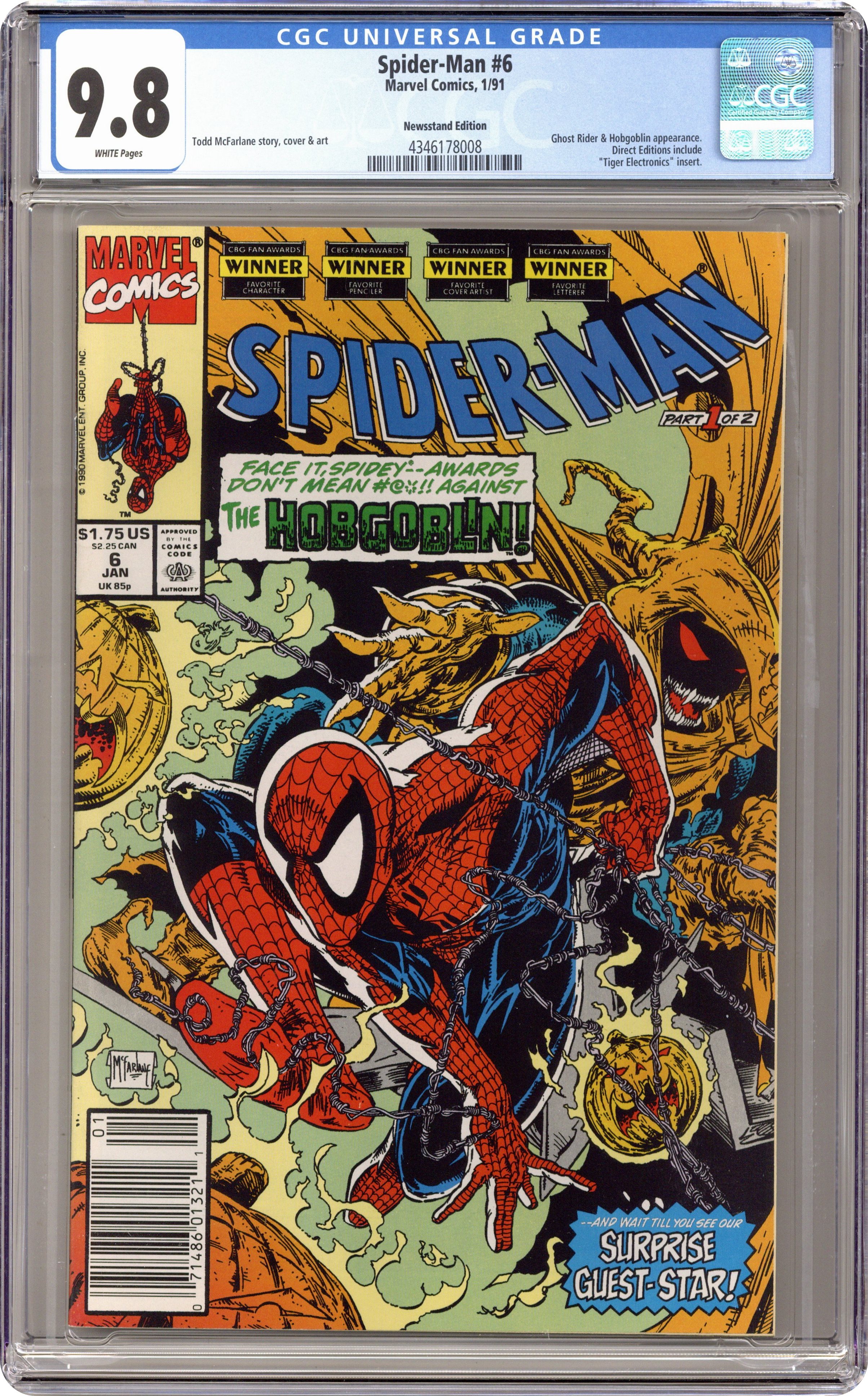 Ended Jan 20 2024 Winning Bid $97 Direct Edition. Masques Part 1 of 2. Guest-starring Ghost Rider. Script and art by Todd McFarlane. Cover by Todd McFarlane. The Hobgoblin (aka the Demogoblin) has sunk further into madness -- and begun kidnapping people and killing them...including children. Law enforcement personnel and the web-slingerare both appalled. And Spider-Man vows to stop the sick super-villain. But someone else in NYC also vows to make the Hobgoblin pay for his crimes: the Spirit of Vengeance! The Hobgoblin better hope the wall-crawler locates himfirst -- and not the Ghost Rider! Cameo appearance by Mary Jane Watson. 36 pages. Cover price $1.75. Grade: CGC 9.8 explanation of grade Condition: Used (collectible)