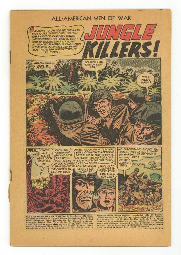 "Jungle Killers," "Operation Tall Tales," "Devil Dogs of Chateau Thierry" (pencils by Gene Colan?), and "Ghost Squadron." Edited by Whitney Ellsworth. Cover by Irv Novick. Stories by Robert Kanigher, Irv Novick, Joe Giella, Bill Woolfolk, Gene Colan, Joe Giella, Irwin Hasen, Nat Barnett, Ross Andru, and Mike Esposito. Adventure tales of war and the military, including some humor—go into combat with All American Men of War! 36 Pages, Full Color. Cover price $0.10. Grade: PR 0.5 explanation of grade Condition: Used (collectible)