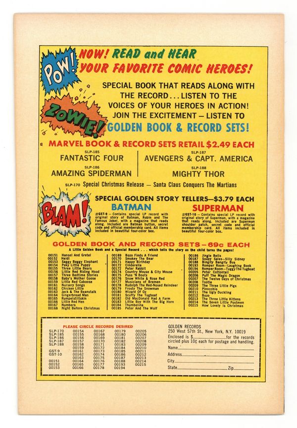 Ended May 5 2025 Winning Bid $811 COMIC ONLY NO RECORD. The Amazing Spider-Man Golden Record Reprint (28-pages, full-color, standard comic format) was produced in 1966 and reprints Amazing Spider-Man #1. Although the reprint, at first glance, looks like the original, there are differences. There is no cover price on the reprint, and the back cover, as well as the inside covers, promote the Golden Record LP series of which the Amazing Spider-Man #1 is a part. The four Marvel Golden Record LPs came with a reprint comic, and each originally sold for $2.49 (record and comic together). In addition to the Amazing Spider-Man LP, there were records produced for Thor (Journey into Mystery #83), Avengers #4; and Fantastic Four #1, all with their own reprint comic. We bought these sets when they first appeared and can still remember following the story in the comic reprint while the record played and the narrator read the story to us. Just to make sure we didn't lose our place, he would say "Turn page," each time he finished the last panel on a page. Grade: FN/VF 7.0 explanation of grade Condition: Used (collectible)
