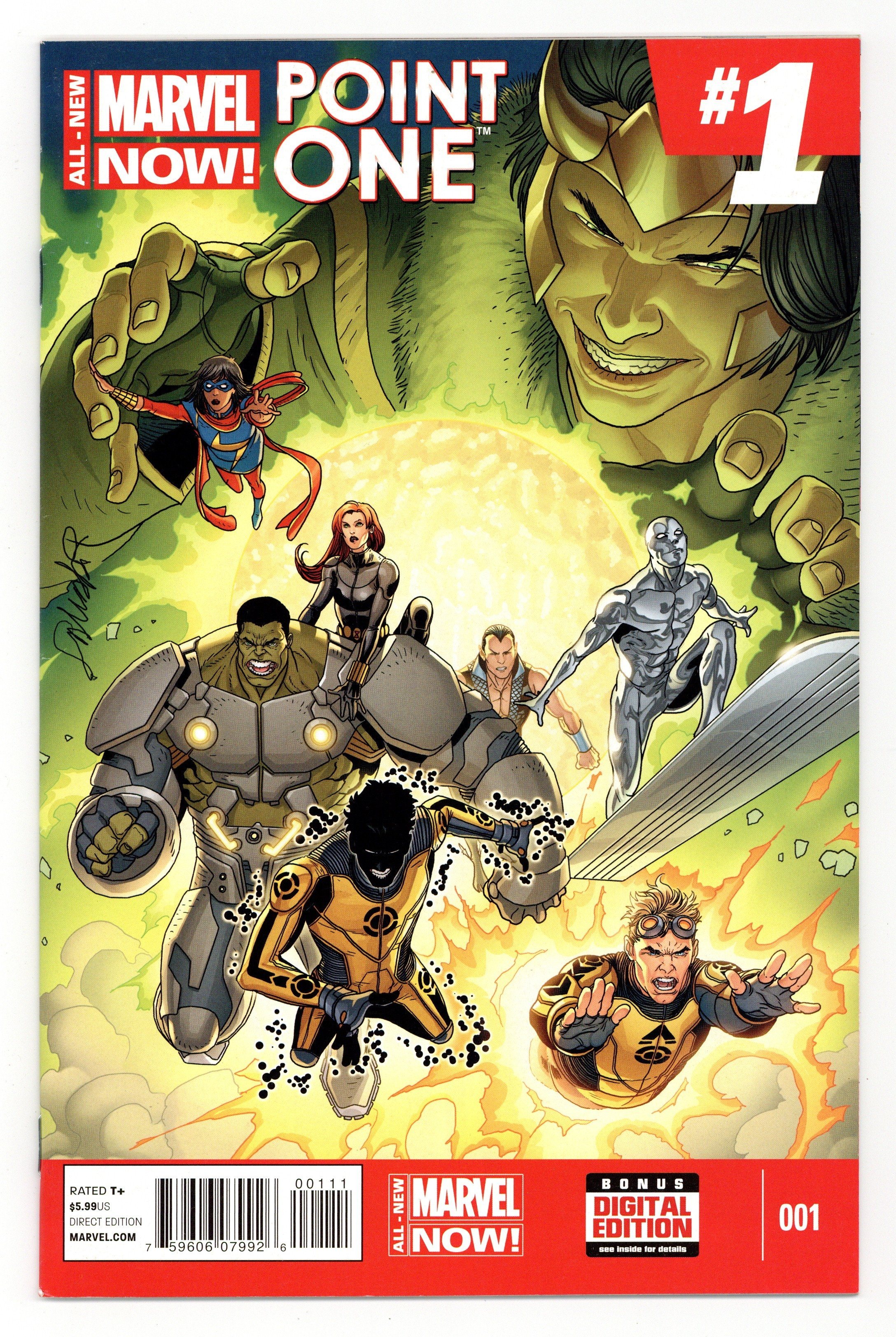 Cover by Salvador Larroca. Written by Al Ewing, Dan Slott, James Robinson, Nathan Edmondson, G. Willow Wilson, Nick Spencer. Art by Lee Garbett, Michael Allred, Steve Pugh, Phil Noto, Adrian Alphona, Rags Morales. Here we go again! It's your one-stop entry point to the world of ALL-NEW MARVEL NOW! Loki embarks on a mission for Asgard! The Silver Surfer and Dawn experience the cosmic rays of Nautikos! A Kree Pursuer and her Special Forces team prepare to invade the Earth! The Black Widow goes undercover in Russia! Who is the new Ms. Marvel? And can even the Indestructible Hulk survive the aid and assistance of fellow Avengers Cannonball and Sunspot? • Features completely new LOKI: AGENT OF ASGARD, SILVER SURFER, BLACK WIDOW, MS MARVEL, ALL-NEW INVADERS and AVENGERS WORLD lead-in stories! Note: First appearance of Kamala Khan as Ms. Marvel Cover price $5.99. Grade: VF 8.0 explanation of grade Condition: Used (collectible)