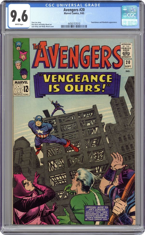 Cover pencils by Jack Kirby, inks by Wally Wood. "Vengeance Is Ours!", script by Stan Lee, pencils by Don Heck, inks by Wally Wood; After jumping over the edge last issue, the Avengers have very little time to rescue Captain America, but with quick thinking they manage it; The Swordsman is outraged and attacks them. During the battle he starts to vanish mysteriously; He awakens in the lair of the Mandarin; The Mandarin allies himself with the Swordsman, giving him a more powerful sword; He then creates an image of Iron Man which he sends to the Avengers, vouching for the Swordsman's membership; Once in the Avengers HQ he plants bombs to destroy them; He later has a change of heart and tries to remove the bombs, but is caught by Captain America, who believes he is attaching them. Avengers Roll Call: Captain America, Hawkeye, Quicksilver, and the Scarlet Witch. Cameo by Iron Man. Reprinted in Marvel Triple Action #14. 36 pgs., full color. $0.12. Cover price $0.12. Grade: CGC 9.6 explanation of grade Condition: Used (collectible)