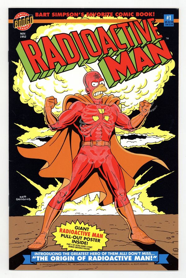Ended May 5 2025 Winning Bid $38 Glow in the dark cover, pencils by Steve Vance, inks by Bill Morrison. #1 has a May, 1952 cover date (although the comic was actually published in 1994). Homer Simpson of the Simpsons as Radioactive Man! The Origin of Radioactive Man, script by Cindy Vance (Plot) and Steve Vance (Plot & Script), pencils by Steve Vance (Layout) and Bill Morrison (Finishes), inks by Bill Morrison. Dr. Crab's Commie Comics, script by Cindy Vance (Plot) and Steve Vance (Plot & Script), pencils by Steve Vance (Layout) and Bill Morrison (Finishes), inks by Bill Morrison; Abandoned Warehouse District; Atom Smasher Ray; CCCP [Cartoon Conduct Code Program]; comics [Hartley; Crime Does Pay; Finger's House of Giant Props; Gloria Grand Show; Gold Record; Headlight; Lurid; Mount Zenith; Smart Mouth Comics]; Soviets; Stab Comics; Tales of Revolting Filth; the Containment Dome; the Geodesic Dome; US Congress; Vile; WZEN; Zenith Seafood Service. Jumbo poster insert. 36 pgs. $2.95. Cover price $2.95. Grade: VF+ 8.5 explanation of grade Condition: Used (collectible)
