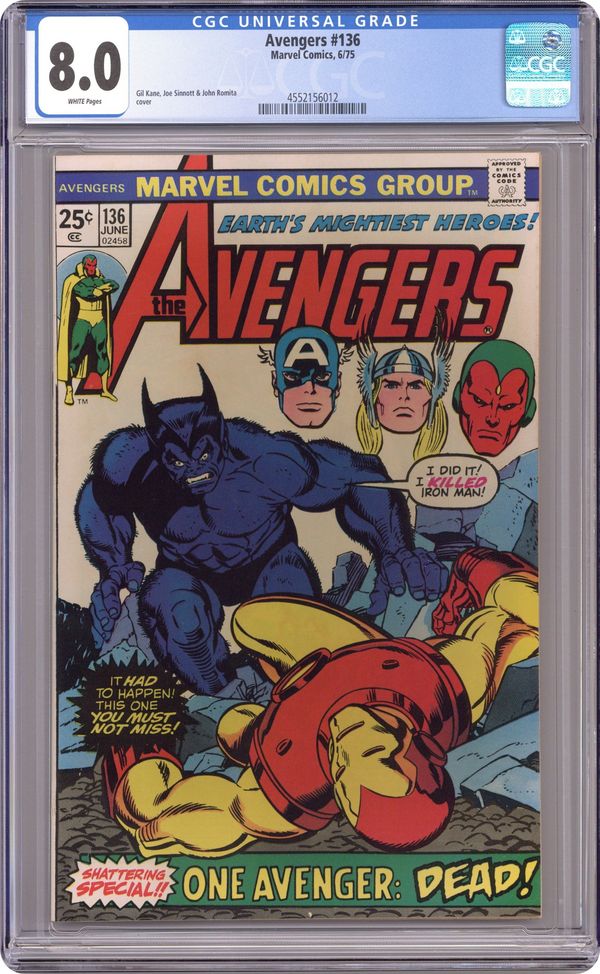 Ended Mar 25 2025 Winning Bid $29 "Iron Man: D.O.A." Script by Steve Englehart. Pencils by Tom Sutton. Inks by Mike Ploog. Cover by Gil Kane and Joe Sinnott. Cover vignettes by John Romita, Sr. and Mike Esposito. The Avengers series take a one-issue hiatus from current events to reprint Amazing Adventures (2nd series) issue 12 (with pages two and three omitted). The freshly mutated Beast makes a latex mask for himself, so he can continue working at the Brand Corporation as Hank McCoy. But when Tony Stark and Marianne Rodgers visit his laboratory, Hank's plan starts to unravel...and sets the stage for a savage battle between the golden avenger and the Beast! (Notes: The cover of Avengers 136 was updated to show the "blue" Beast. In the actual story, the Beast is colored gray. Giant-Size Avengers 4 was published the same month as this reprint issue.) 36 pgs. Cover price $0.25. Grade: CGC 8.0 explanation of grade Condition: Used (collectible)