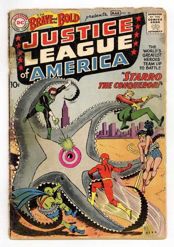Cover by pencils Mike Sekowsky, inks by Murphy Anderson. First appearance of Justice League of America, Starro, and Snapper Carr in "Starro the Conqueror!", script by Gardner Fox, pencils by Mike Sekowsky, inks by Bernard Sachs, Joe Giella, and Murphy Anderson; Peter the Puffer Fish alerts Aquaman to an attack on Earth from an alien starfish named Starro the Conqueror; Starro has altered three ordinary starfish into his lieutenants; Aquaman alerts his friends Wonder Woman, Superman, Green Lantern, Batman, Flash, and J'onn J'onzz; Though Superman and Batman are too busy to attend, the rest meet and split up into teams. It's Fun to Help Others! public service announcement with Superboy by Jack Schiff, art by Curt Swan and Stan Kaye. Starro vs. Green Lantern, script by Gardner Fox, pencils by Mike Sekowsky, inks by Joe Giella; One of Starro's lieutenants steals and explodes an atomic bomb to absorb its power. Starro vs. Wonder Woman and John Jones, script by Gardner Fox, pencils by Mike Sekowsky, inks by Bernard Sachs. Starro vs. the Flash!, script by Gardner Fox, pencils by Mike Sekowsky, inks by Murphy Anderson. Starro vs. Justice League of America, script by Gardner Fox, pencils by Mike Sekowsky, inks by Bernard Sachs. 36 Pages, Full Color. Cover price $0.10. Grade: FR 1.0 explanation of grade Condition: Used (collectible)